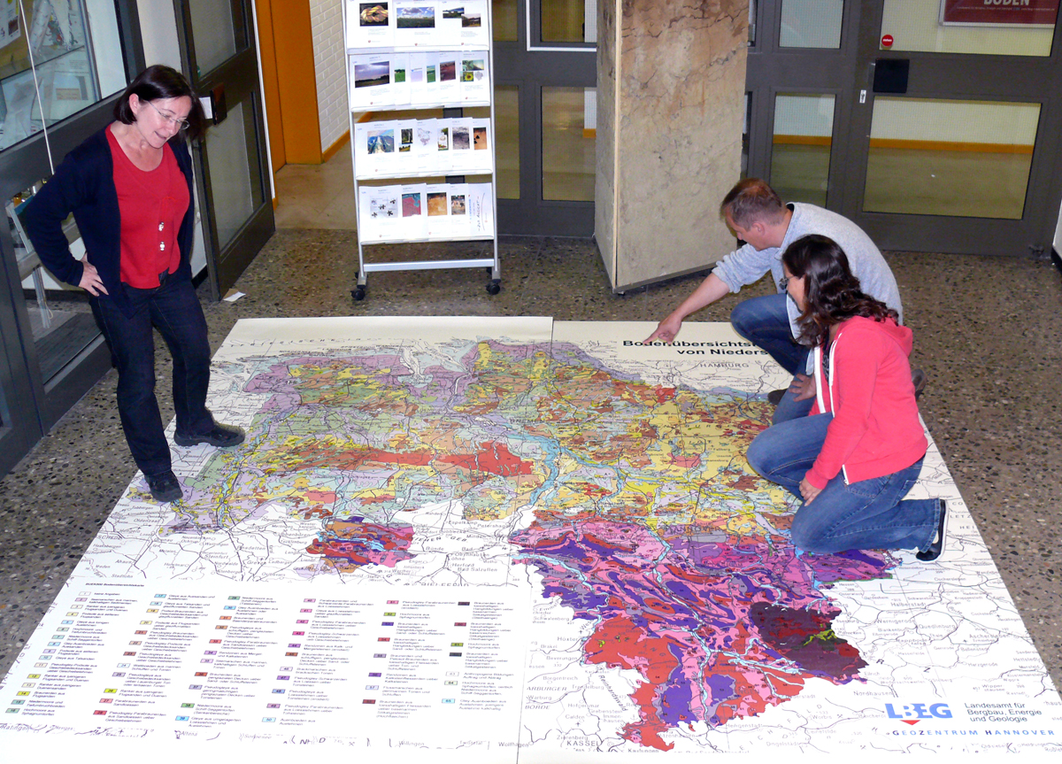 Die begehbare Bodenkarte erlaubt dem Betrachter einen schnellen Überblick über die Verteilung der unterschiedlichen Böden in Niedersachsen. Die Darstellung auf dem 3 x 3 m großen PVC-Bodenbelag ist übersichtlich und ermöglicht eine schnelle Orientierung innerhalb der Bodenlandschaften Niedersachsens. Die begehbare Bodenkarte animiert den Betrachter dazu, die Böden an seinem Heimatort „unter die Lupe zu nehmen“. Die Legende ist auch für den Laien verständlich gehalten. Als Blickfang ist die begehbare Bodenkarte sehr geeignet, das Interesse auf weitere Schaustücke oder Informationstafeln zu lenken.