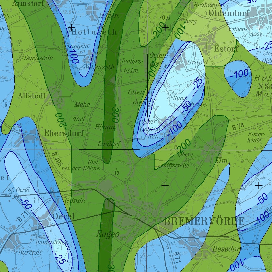 In den Lockergesteinsgebieten Niedersachsens werden großräumig zwei übergeordnete Grundwasserleiter-Komplexe unterschieden. Der obere Grundwasserleiter-Komplex setzt sich aus Sanden und Kiesen des Pleistozän sowie aus Sanden des Pliozän und des Obermiozän zusammmen. Der untere Grundwasserleiter-Komplex besteht aus durchlässigen Sedimenten des Unter- bis Mittelmiozän, den sog. Braunkohlensanden. Getrennt werden die beiden Grundwasserleiter-Komplexe durch den Grundwasserhemmer Oberer Glimmerton, der aus schluffig-tonigen Sedimenten des Mittel- bis Obermiozän besteht. Gebiete, in denen der Obere Glimmerton großflächig verbreitet ist, sind in blauen Farbtönen dargestellt (nur auf den Blättern CC2318 Neumünster, CC3118 Hamburg-West, und CC3126 Hamburg-Ost).