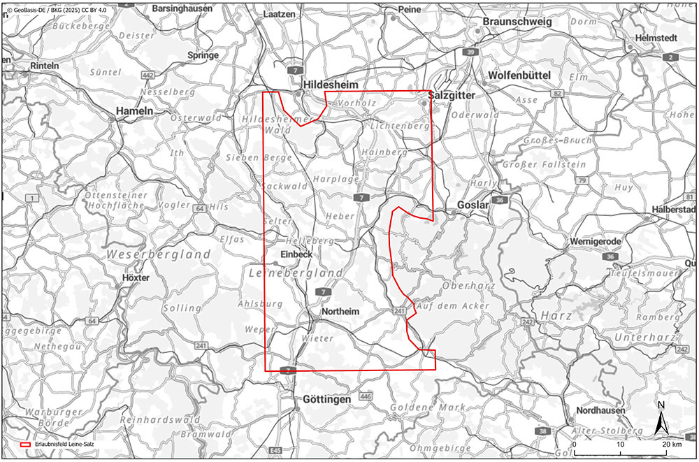 Das Landesamt für Bergbau, Energie und Geologie (LBEG) hat der Anglo American Exploration Germany GmbH mit Sitz in Düsseldorf das Erlaubnisfeld „Leine-Salz“ zugeteilt. Die Erlaubnis zur Aufsuchung von Stein-, Kali-, Magnesia- und Borsalzen zu gewerblichen Zwecken ist vom 1. Mai 2025 bis 31. Dezember 2028 auf etwas mehr als dreieinhalb Jahre befristet. Das Erlaubnisfeld „Leine-Salz“ ist gut 1961 Quadratkilometer groß und erstreckt sich von Herzberg am Harz im Südosten und Hardegsen im Südwesten bis Salzgitter im Nordosten und Hildesheim im Nordwesten. Es ist deckungsgleich mit dem Erlaubnisfeld „Leine-Kupfer“, das die Anglo American Exploration Germany GmbH bereits zum 1. Januar 2024 zugeteilt bekommen hat uns das ebenfalls bis zum 31. Dezember 2028 befristet ist.
