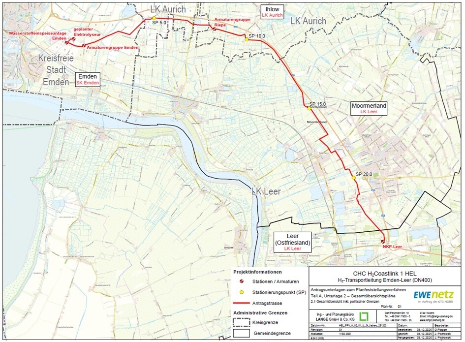 Die Firma EWE Netz GmbH plant, eine Wasserstoffleitung unter dem Namen „H2Coastlink 1 HEL H2-Transportleitung Emden-Leer“ (HEL) zu bauen und zu betreiben. Für das Vorhaben werden jetzt die Antragsunterlagen ausgelegt.