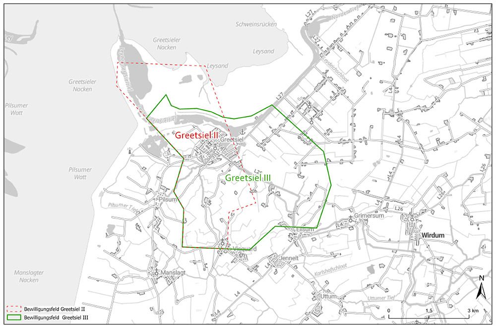 Die BEB Erdgas und Erdöl GmbH & Co. KG hatte im Juli vergangenen Jahres die Neustreckung des ihr ursprünglich bis 5. Juli 2025 zugeteilten Bewilligungsfelds Greetsiel II beantragt. Da sich die Fläche jedoch dabei ausweitet, hat das LBEG den Antrag im Sinne des Bundesberggesetzes (BBergG) als Neuzuteilung behandelt. Das Feld Greetsiel III ist gut acht Quadratkilometer größer als das vorherige Bewilligungsfeld Greetsiel II und dehnt sich dabei nach Osten aus, berührt jedoch durch eine Reduzierung im Norden keine Flächen des Nationalparks Wattenmeer mehr.