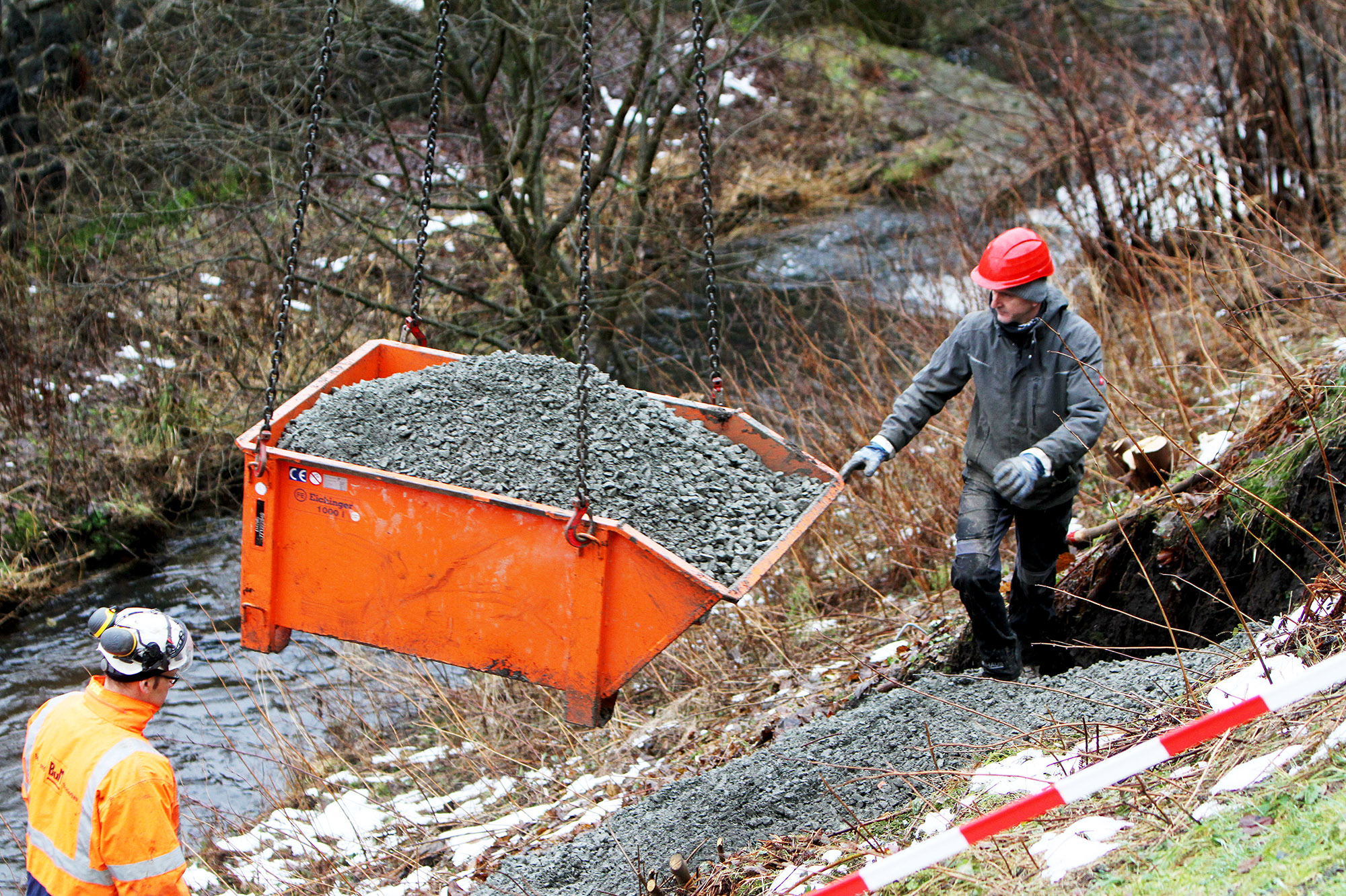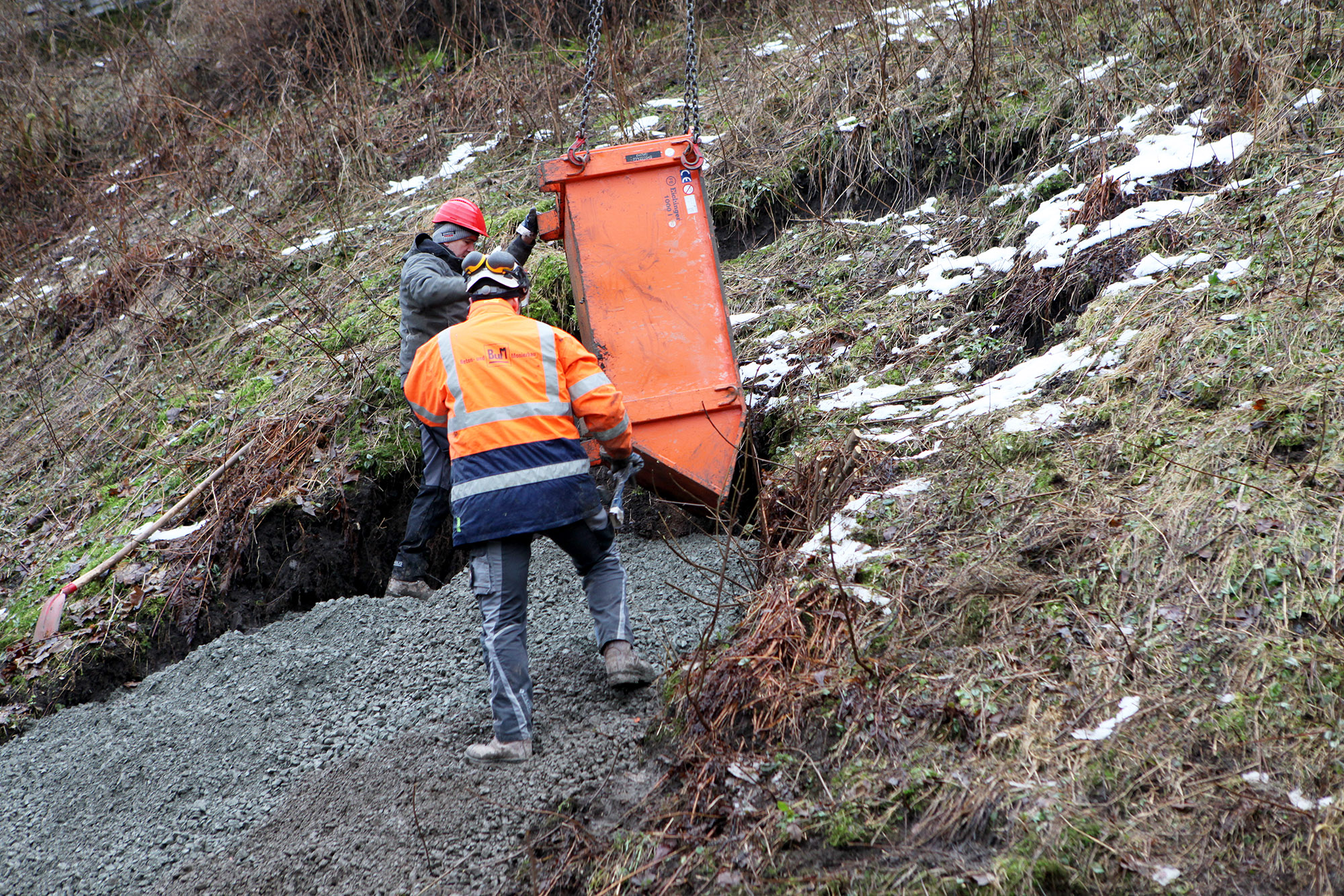 „Um in dem steilen Hang weitere Nachrutschungen zu vermeiden, haben wir den Tagesbruch zunächst einmal gesichert“, so Thomas Finkeldey weiter. Kein leichtes Unterfangen für die Spezialisten einer beauftragten Fachfirma aus Herten. Die Schadensstelle ist nur über eine schmale Fußgängerbrücke über die Innerste zu erreichen. Um zunächst 19 Tonnen Beton in das Loch zu füllen, genügten noch Pumpen und Schläuche. Doch um das oberste Stück des Trichters so zu füllen, dass die Hangneigung wieder nachempfunden wird, war Kies nötig. Jedoch ist die Fußgängerbrücke so schmal, dass die Fachleute das Material nicht einmal per Schubkarre hätten anliefern können. Daher mussten die insgesamt zehn Tonnen Kies, die benötigt wurden, in einer kleinen Mulde per Autokran über die Innerste gehoben werden. Die Kosten der Gesamtmaßnahme belaufen sich auf rund 20.000 Euro.