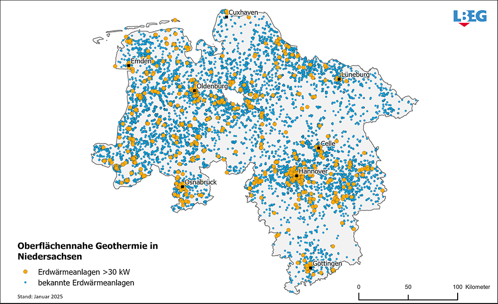 Zum ersten Mal veröffentlicht das Landesamt für Bergbau, Energie und Geologie (LBEG) Jahresstatistiken zur oberflächennahen Geothermie in Niedersachsen. Nachdem das LBEG in seiner Eigenschaft als Niedersächsischer Geothermiedienst (NGD) bereits in den vergangenen beiden Jahren Statistiken zur Tiefengeothermie – also zur Erdwärmegewinnung aus Tiefen von mehr als 400 Metern – präsentiert hat, fasst es nun erstmals Zahlen zu Geothermievorhaben in Niedersachsen zusammen, die aus Schichten nahe der Oberfläche Erdwärme gewinnen.