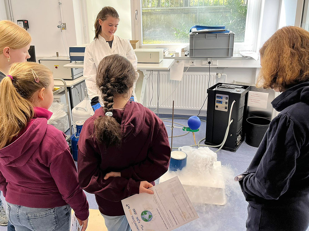 Im Geochronologie-Labor des LIAG ging es auf Spurensuche: „Ein Sandkorn packt aus“ zeigte eindrucksvoll, wie Forschende kleinste Hinweise nutzen, um große Fragen zu beantworten – etwa zur Klima- und Umweltgeschichte der Erde. Besonders eindrucksvoll waren die Untersuchungen von Proben unter Rotlicht in einem stockdunklen Raum, bei denen Lumineszenzsignale sichtbar gemacht wurden. Für staunende Blicke sorgten zudem Experimente mit Flüssigstickstoff: Dabei wurden Materialien innerhalb weniger Sekunden tiefgefroren, um Veränderungen ihrer Eigenschaften bei extrem niedrigen Temperaturen zu veranschaulichen.