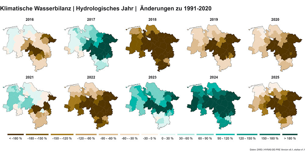 Zu den wenigen Niederschlägen kommen auch noch gestiegene Temperaturen, die für mehr potenzielle Verdunstung sorgen. „Das beides zusammengenommen ergibt für Niedersachsen eine Klimatische Wasserbilanz von minus 50 Millimetern in 2025“, sagt Gabriele Ertl, Hydrogeologin im LBEG. „Gegenüber dem Vergleichszeitraum 1991 bis 2020 sind das 174 Millimeter oder eben 141 Prozent weniger Wasser, das potentiell zur Verfügung steht“, verdeutlicht sie.