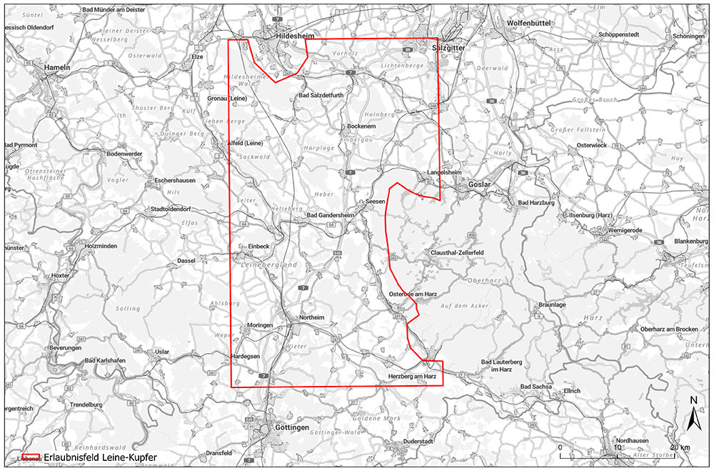 Das Landesamt für Bergbau, Energie und Geologie (LBEG) teilt der Anglo American Exploration Germany GmbH mit Sitz in Düsseldorf das Erlaubnisfeld „Leine-Kupfer“ zu. Die Erlaubnis zur Aufsuchung von Kupfer, Blei, Zink, Silber, Gold, Zinn, Wolfram, Molybdän, Vanadium, Kobalt und Nickel zu gewerblichen Zwecken ist zunächst vom 1. Januar 2024 bis 31. Dezember 2028 auf fünf Jahre befristet. Das Erlaubnisfeld „Leine-Kupfer“ ist gut 1961 Quadratkilometer groß und erstreckt sich von Herzberg am Harz im Südosten und Hardegsen im Südwesten bis Salzgitter im Nordosten und Hildesheim im Nordwesten.
