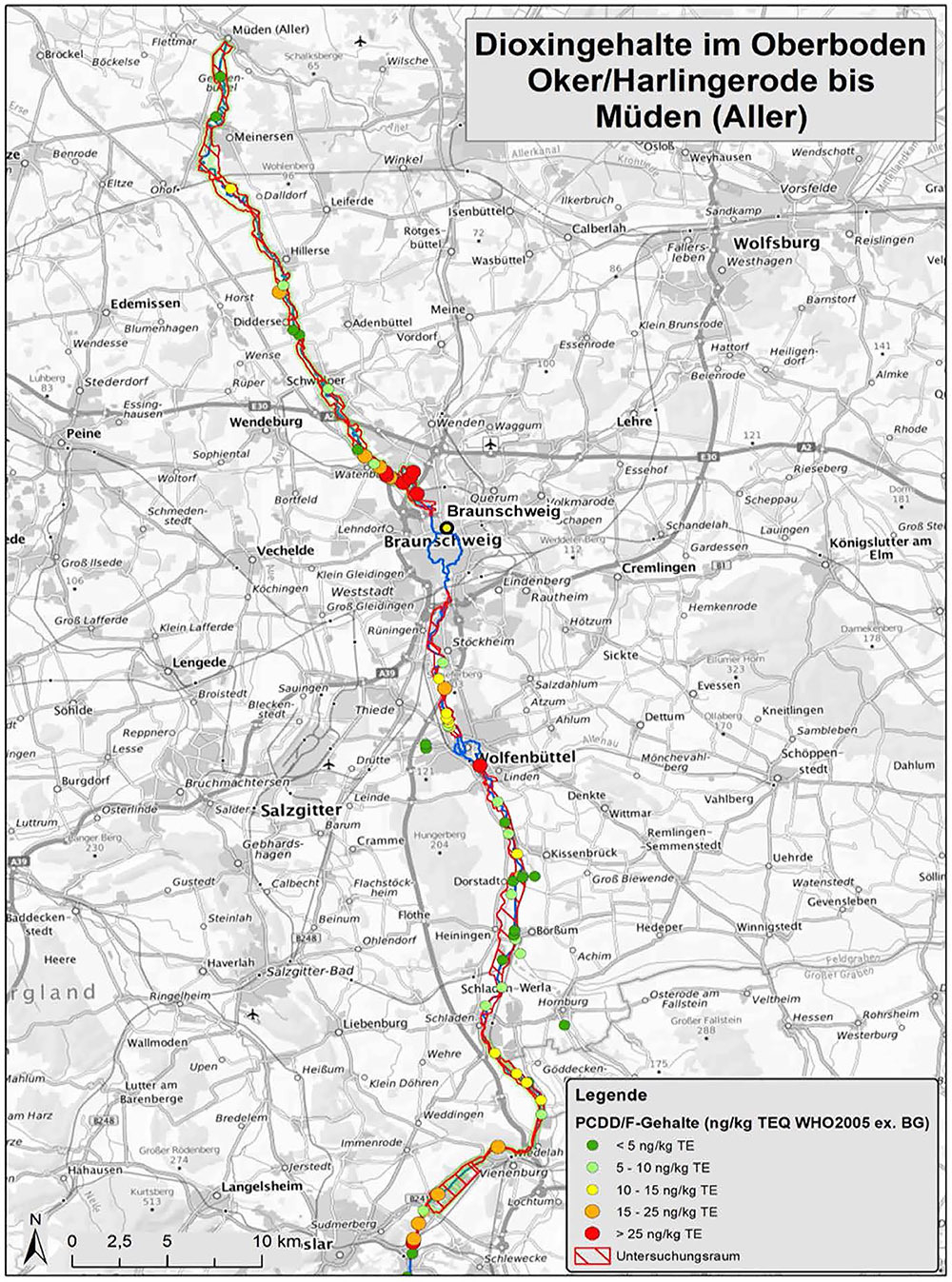 Vielfach liegen diese Orte zwischen Oker-Harlingerode und Vienenburg (Landkreis Goslar). Dort allerdings werden die Okerauen nicht für die Futtermittelgewinnung genutzt, so dass ein Einfluss auf die Viehhaltung oder letztlich auf den Menschen über diesen sogenannten Wirkungspfad nicht zu erwarten ist. Anders sieht es hingegen im Nordwesten Braunschweigs zwischen Ölper und dem Mittellandkanal aus, wo die Auen landwirtschaftlich genutzt werden und wo in der Veltenhofer Schleife der Spitzenwert von 55 Nanogramm gemessen wurde.