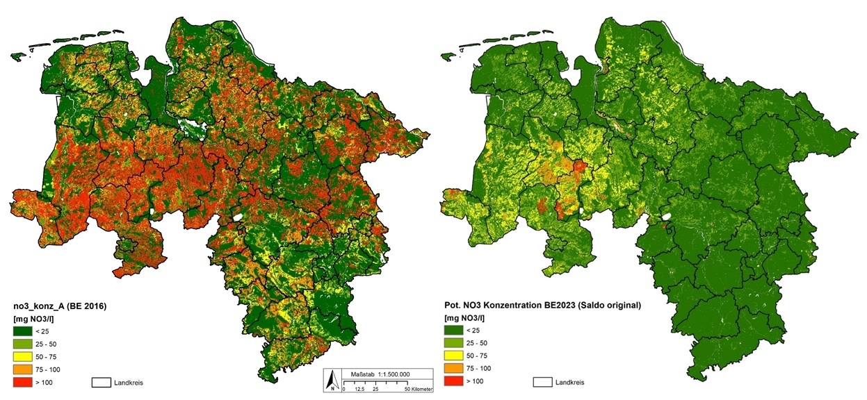 Ein Grund für die deutliche Abnahme der Nitratkonzentration ist die Abnahme der Tierzahlen. Vor allem aber geht die Landwirtschaft in den allermeisten Teilen Niedersachsens deutlich effizienter mit Stickstoff beim Düngen von Äckern um. Der Einsatz von Stickstoff-Mineraldünger hat sich in den vergangenen zehn Jahren nahezu halbiert. „Das zeigt, dass Landwirtschaft und Umweltschutz sehr gut vereinbar sind“, erklärt LBEG-Chef Carsten Mühlenmeier. Dabei betont er, welche Bedeutung diese Entwicklung für den Grundwasserschutz hat: „In keinem Grundwasserkörper wird der Schwellenwert für die Nitratkonzentration im Sickerwasser nach Bewertungsgrundlage der EG-Wasserrahmenrichtlinie überschritten. Und das ist ein Novum für Niedersachsen.“