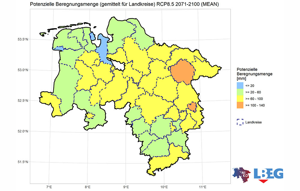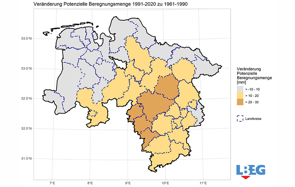 Demnach hat im Niedersachsenmittel die potenzielle Beregnungsbedürftigkeit von 1961-1990 zu 1991-2020 um etwa zehn Millimeter zugenommen. Regionale Unterschiede sind deutlich erkennbar. Am deutlichsten sind die Zunahmen in den Landkreisen Holzminden (+24 mm) und Hameln-Pyrmont (+21 mm). Celle, Schaumburg und Hannover liegen mit +20 mm knapp dahinter. Im Bereich der Küste sind nur geringe Änderungen erkennbar.