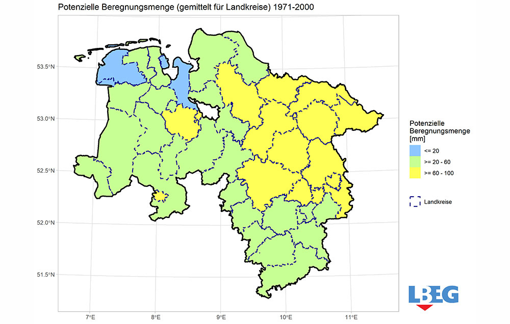 Die potenzielle Beregnungsbedürftigkeit in Niedersachsen hat zugenommen und wird weiter zunehmen. Das zeigen die Daten, die das Landesamt für Bergbau, Energie und Geologie (LBEG) neu auf dem NIBIS®-Kartenserver zur Verfügung stellt. Zusammen mit dem Niedersächsischen Kompetenzzentrum Klimawandel (NIKO) hat das LBEG die Karten zur potenziellen Beregnungsbedürftigkeit für die Vergangenheit und Zukunft in Niedersachsen erarbeitet. Sie liefern unter anderem eine wichtige Datengrundlage für die Landwirtschaft und die wasserwirtschaftliche Planung und Genehmigung.