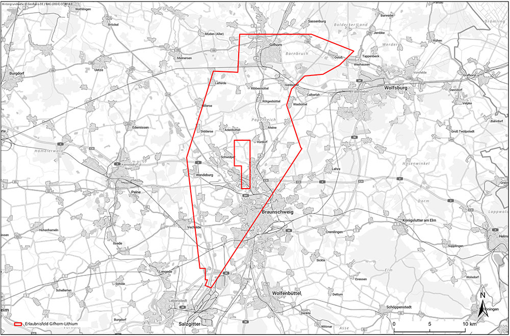 Das Landesamt für Bergbau, Energie und Geologie (LBEG) hat der Lilac Solutions Deutschland GmbH mit Sitz in München das Erlaubnisfeld „Gifhorn-Lithium“ zur Aufsuchung von Lithium zugeteilt. Das Feld ist gut 373 Quadratkilometer groß und erstreckt sich zwischen dem Werksgelände der Salzgitter AG im Süden und dem nördlichen Gifhorner Stadtrand sowie zwischen Wendeburg im Westen und Weyhausen im Nordosten. Dabei bleibt eine Fläche nördlich und östlich des Braunschweiger Hafens ausgespart. Die Erlaubnis ist zunächst befristet auf fünf Jahre bis zum 28. Februar 2030.