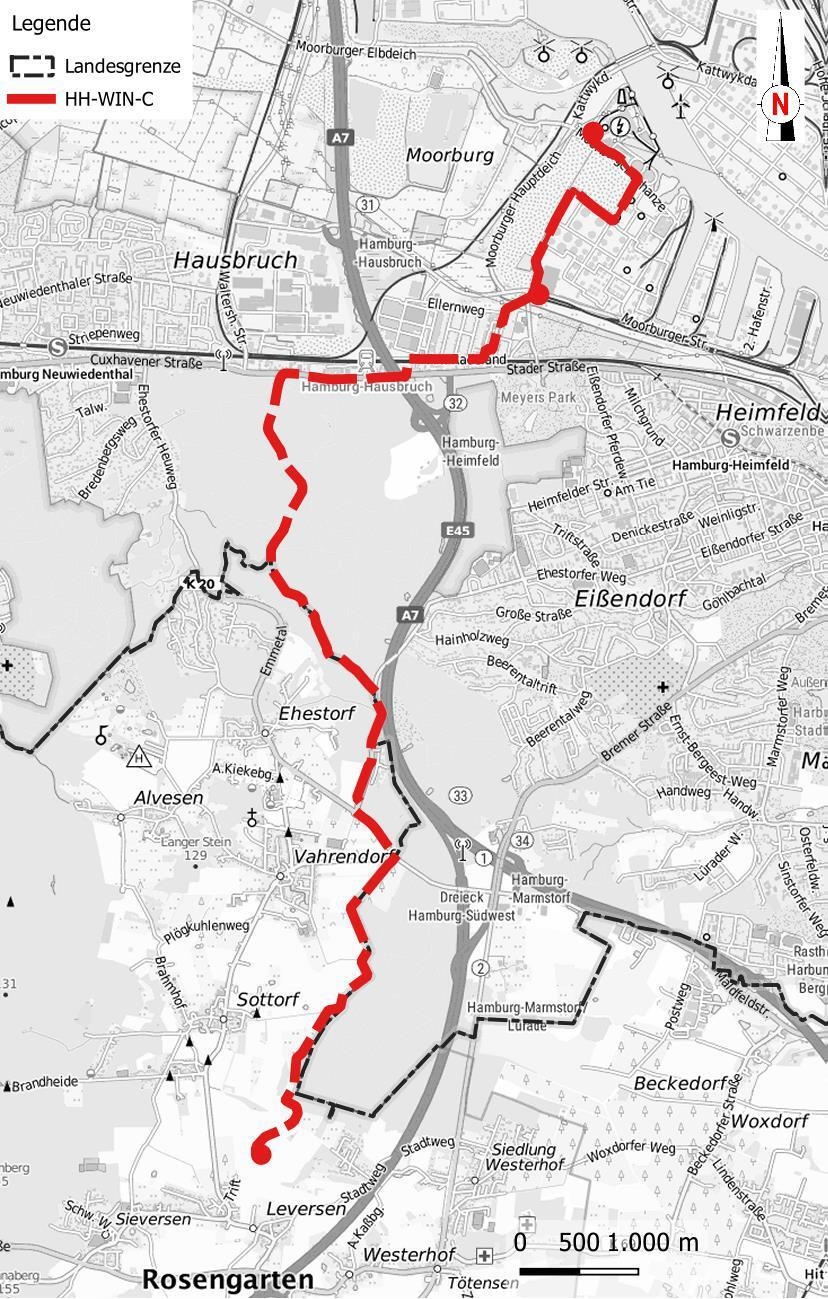 Knapp vier Kilometer der HH-WIN-C70 genannten Wasserstoff-Anbindungsleitung sollen vom Hamburger Stadtgebiet kommend östlich von Ehestorf, Vahrendorf und Sottdorf entlang der Landesgrenze zum Anbindungspunkt an das Transportnetz der Gasunie Deutschland Transport Services GmbH bei Leversen verlaufen. Für den gut neun Kilometer langen Abschnitt auf Hamburger Seite wird ein gesondertes Planfeststellungsverfahren durch die Behörde für Umwelt, Klima, Energie und Agrarwirtschaft (BUKEA) geführt.