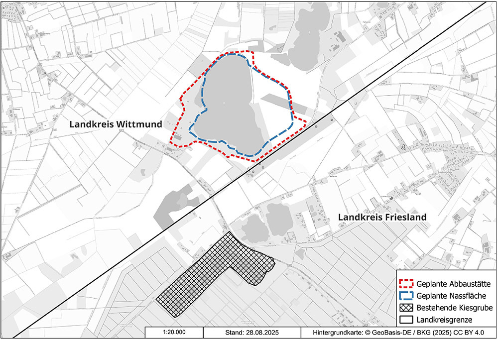Das LBEG weist vorsorglich darauf hin, dass es sich explizit um das Vorhaben im Landkreis Wittmund, nordöstlich der Bundesstraße 437 handelt. Derzeit wird in nur rund einem Kilometer Entfernung, allerdings schon im Landkreis Friesland und auf der anderen Seite der Bundesstraße 437, ein ähnliches Verfahren geführt. Der dortige Tagebau steht jedoch nicht unter Bergrecht, entsprechend wird dieses Verfahren nicht beim LBEG geführt.