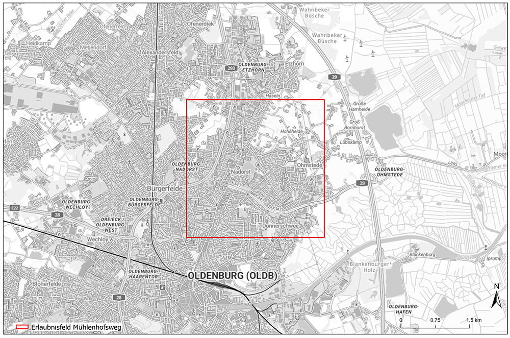 Das Landesamt für Bergbau, Energie und Geologie (LBEG) teilt der Stadt Oldenburg (Oldenburg) das Erlaubnisfeld „Mühlenhofsweg“ zu. Die Erlaubnis zur Aufsuchung von Erdwärme zu gewerblichen Zwecken ist zunächst vom 1. Februar 2024 bis 31. Januar 2027 auf drei Jahre befristet. Das Erlaubnisfeld „Mühlenhofsweg“ ist knapp 9 Quadratkilometer groß und erstreckt sich im Nordosten von Oldenburg über die Stadtteile Nadorst, Ohmstede und Donnerschwee.