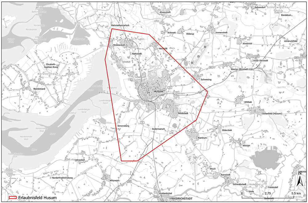 Das Landesamt für Bergbau, Energie und Geologie (LBEG) teilt der Stadtwerke Husum GmbH das Erlaubnisfeld „Husum“ zu. Die Erlaubnis zur Aufsuchung von Erdwärme zu gewerblichen Zwecken ist zunächst vom 1. März 2024 bis 28. Februar 2026 auf zwei Jahre befristet. Das Erlaubnisfeld „Husum“ ist gut 98,5 Quadratkilometer groß und erstreckt sich rund um die Hafenstadt Husum zwischen Hattstedt im Nordwesten und Mildstedt im Südosten.