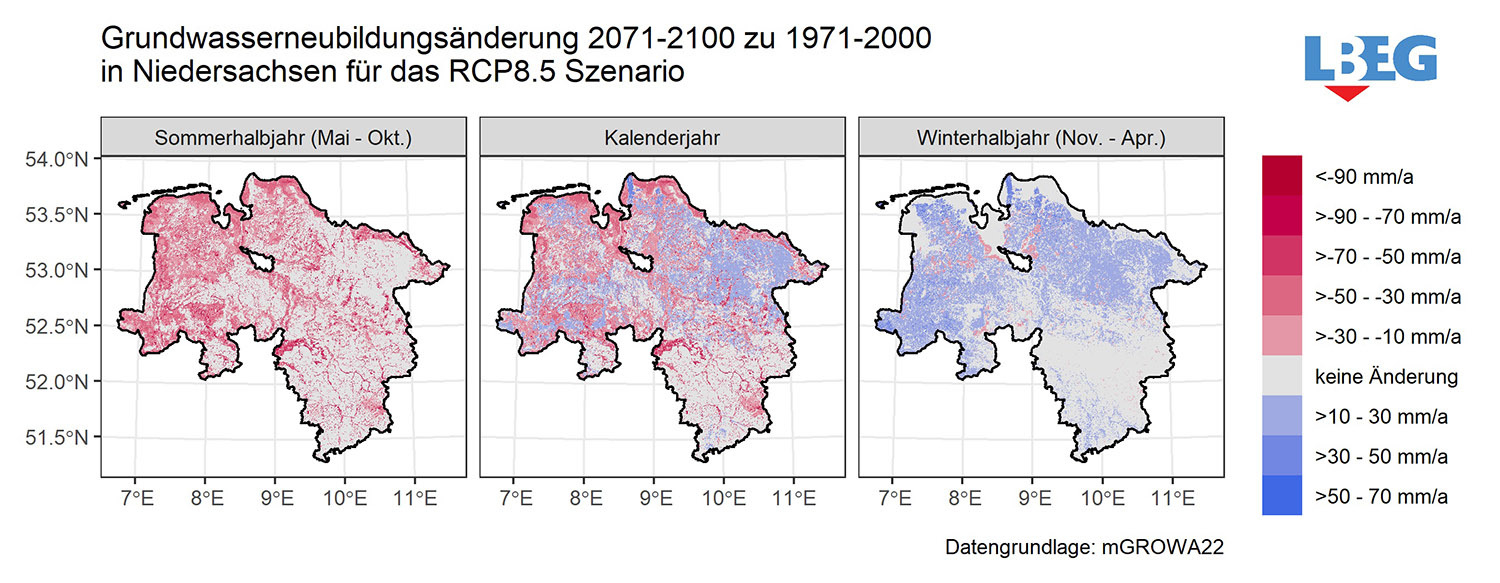 Das LBEG hatte unlängst das aufwendig novellierte Modell des monatlichen Großräumigen Wasserhaushalts (mGROWA) veröffentlicht und daraus zwei Multi-Modell-Ensembles berechnet, die ein Szenario mit intensivem Klimaschutz und ein Szenario ohne Klimaschutz für die Grundwasserneubildung im Zeitraum 2071-2100 zeigen. Im Ergebnis nimmt bei steigender Treibhausgasemissionen die Grundwasserneubildung im Sommerhalbjahr ab und im Winterhalbjahr zu.