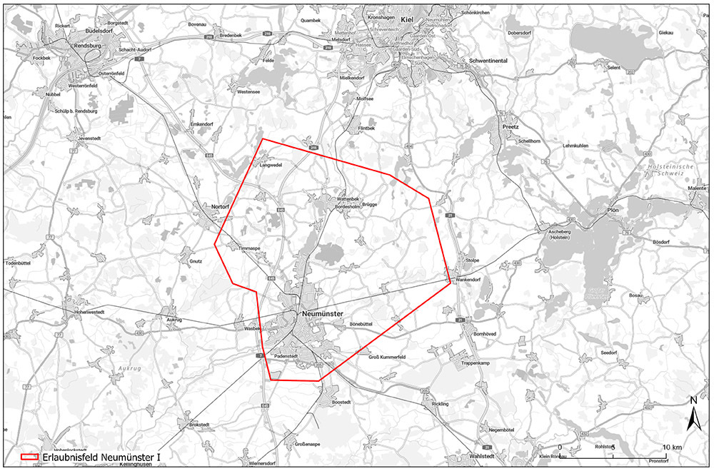 Das Landesamt für Bergbau, Energie und Geologie (LBEG) teilt der SWN Stadtwerke Neumünster GmbH das Erlaubnisfeld „Neumünster I“ zu. Die Erlaubnis zur Aufsuchung von Erdwärme zu gewerblichen Zwecken ist zunächst vom 1. Dezember 2023 bis 30. November 2025 auf zwei Jahre befristet. Das Erlaubnisfeld „Neumünster I“ ist annähernd 327 Quadratkilometer groß und erstreckt sich von Neumünster im Süden bis Blumenthal im Norden sowie von Nortorf im Westen bis Wankendorf im Osten.