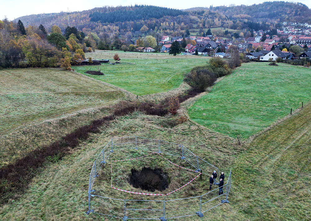 Ein Tagesbruch ist auf einer Wiese bei Wolfshagen im Harz (Landkreis Goslar) entstanden. Der durch frühere Bergbautätigkeiten gefallene Tagesbruch liegt außerhalb der Ortschaft und ist mit einem Bauzaun abgesperrt. Damit stellt er keine Gefahr mehr für Mensch und Umwelt dar.