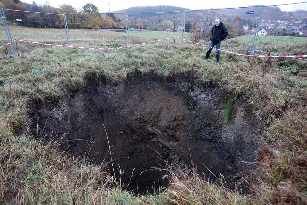 Rund acht Meter tief und fünf Meter im Durchmesser ist der Krater groß und liegt auf einer landwirtschaftlichen Brachfläche. Die nächste Bebauung ist knapp 200 Meter entfernt. „Das ist von den Umständen her ideal“, sagt Thomas Finkeldey, zuständiger Spezialist für Altbergbau beim Landesamt für Bergbau, Energie und Geologie (LBEG). „Hier verlaufen keine Wege, so dass Passanten hätten gefährdet werden können als der Tagesbruch fiel. Und Gebäude oder Infrastruktur sind auch nicht betroffen“, so der Experte.