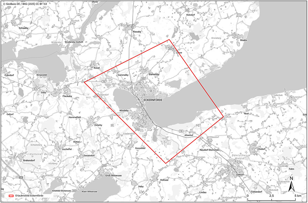 Zur Aufsuchung von Erdwärme aus mehr als 400 Metern Tiefe hat das Landesamt für Bergbau, Energie und Geologie (LBEG) der Stadtwerke Eckernförde GmbH zum 1. Mai das Erlaubnisfeld „Eckernförde“ zugeteilt. Das Feld ist etwas mehr als 95 Quadratkilometer groß und erstreckt sich von Gammelby im Nordwesten bis Altdorf im Südosten sowie von Loose im Nordosten bis Goosefeld im Südwesten rund um die Hafenstadt mitsamt Teilen der Eckernförder Bucht. Die Erlaubnis ist befristet auf drei Jahre bis zum 30. April 2028.