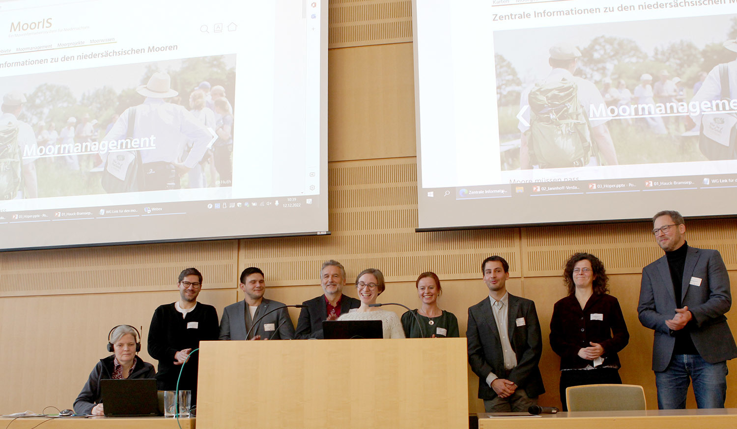 Katharina Hauck-Bramsiepe, Projektleiterin beim LBEG, stellte zusammen mit Lennard Heidberg vom NLWKN die fünf wesentlichen Bausteine des MoorIS vor: Karten, Moorgebiete, Moorprojekte, Moormanagement und Moorwissen. Unter diesen fünf Kapiteln bietet die Internetplattform Flächen- und Gebietsinformationen, Übersicht über Projekte, Praxisbeispiele, Arbeitshilfen, Empfehlungen, Standards und Hintergrundwissen. Im Anschluss an den offiziellen Start der Internetplattform hatten die Teilnehmer der Tagung im Geozentrum Hannover die Gelegenheit, die Inhalte des Moorinformationssystems kennenzulernen.