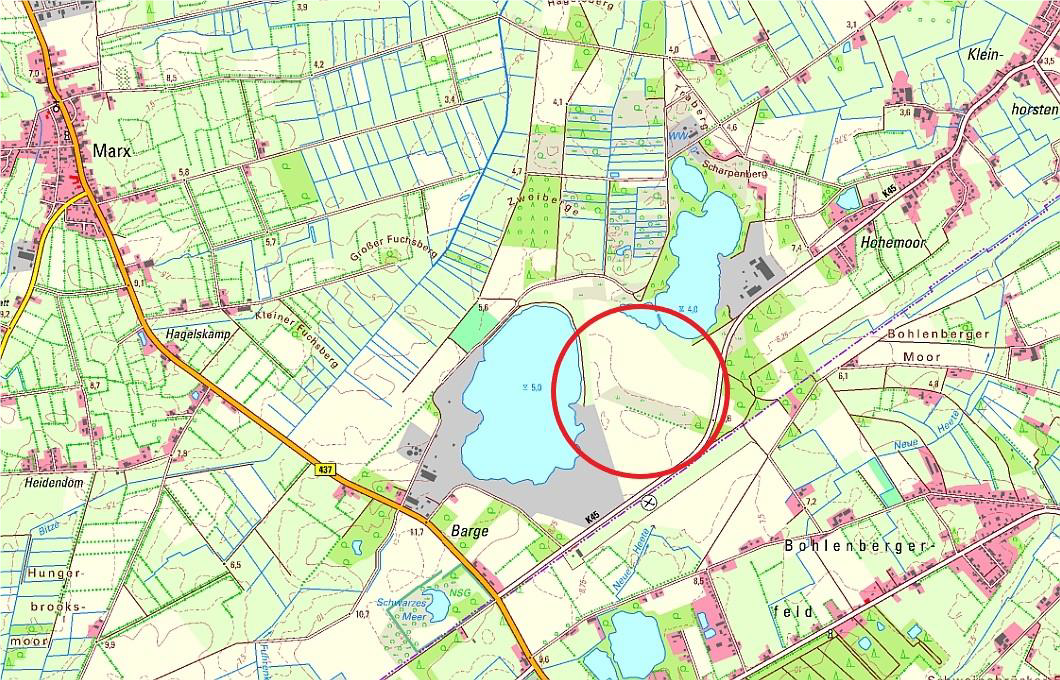Die Quarzwerke Marx AG plant den Abbau von Quarzsand im Nassabbauverfahren durch Erweiterung und Vertiefung einer bestehenden Gewinnungsstätte auf einer Fläche im Landkreis Wittmund in der Gemeinde Friedeburg (Ortsteil Marx-Barge). Die Fläche befindet sich nordöstlich der B437 (Marxer Hauptstraße) sowie nordwestlich der K45 (Straße Hohemoor).