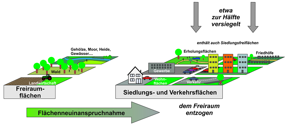 Ein Teil der Böden von Siedlungs- und Verkehrsflächen wird versiegelt. Die Versiegelung von Böden hat negative Auswirkungen auf den Naturhaushalt, die vielfältigen Funktionen der Böden gehen verloren. Beispiele hierfür sind: