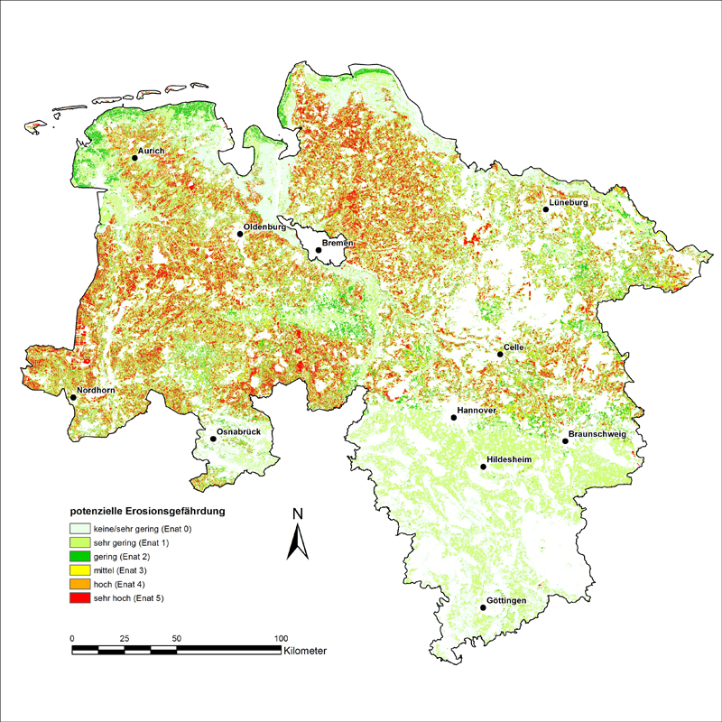 Bodenabträge durch Erosion sind nach den Grundsätzen der guten fachlichen Praxis (§ 17 BBodSchG) so weit wie möglich zu vermeiden. Für einen wirkungsvollen Winderosionsschutz ist es notwendig, die von Winderosion betroffenen Gebiete zu kennen. Das LBEG entwickelte eine Methode, die es aufgrund landesweit vorhandener Daten ermöglicht, die potenzielle Winderosionsgefährdung zu ermitteln und in einer Karte im 12,5 m Raster abzubilden.