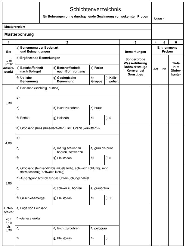 Es erfolgte eine Ausgliederung von Unterschichten. Diese ist ein Mittel der logischen Strukturierung und verbessert die Übersichtlichkeit und Auswertbarkeit der Schichtbeschreibung erheblich. Da die Unterschichten in der gleichen Weise beschrieben werden wie die Hauptschichten, können Schichtenverzeichnisse in der gewohnten Weise in einem DIN 4022 Formblatt als Produkt der Bohrdatenbank von Niedersachsen ausgedruckt werden. Schichtenverzeichnisse können über den Bohranfragedienst angefordert werden.