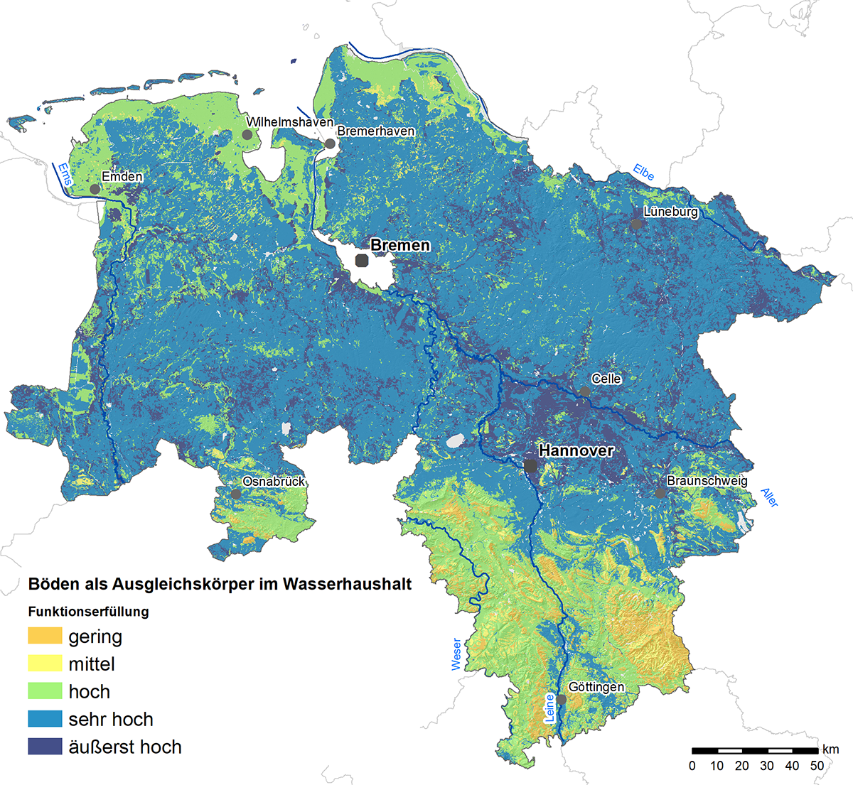 Im NIBIS® werden die vorliegenden Boden-, Klima- und Reliefdaten mit Hilfe von Auswertungsmethoden (s. GeoBericht 19) weiterverarbeitet und so Themenkarten erstellt. Im NIBIS® Kartenserver werden eine Vielzahl dieser Auswertungskarten zur Ansicht und zum Download kostenfrei angeboten. Beispiele dafür sind die Wasserspeicherfähigkeit der Böden (nutzbare Feldkapazität im effektiven Wurzelraum), die Bodenkundliche Feuchtestufe, die Sickerwasserrate aus dem Boden (nach TUB-BGR-Verfahren), die Empfindlichkeit der Böden gegenüber Bodenverdichtung, das Denitrifikationspotenzial oder auch die Grabbarkeit von Böden.