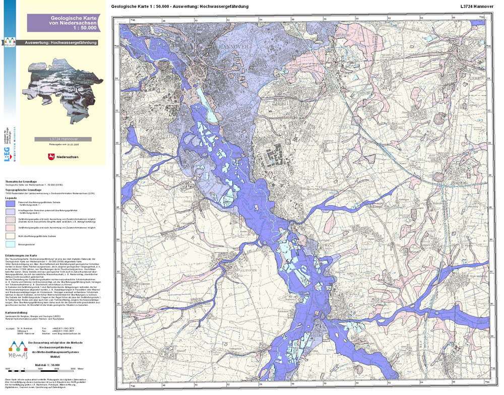 Die Auswertungskarte „Frühgeschichtliche Hochwasserereignisse in Niedersachsen“ (GFH50) ist eine aus dem digitalen Datensatz der Geologischen Karte von Niedersachsen 1 : 50 000 (GK50) abgeleitete Karte. Unter Berücksichtigung von Alter, Beschaffenheit und Entstehungsart geologischer Schichten werden in dieser Karte Flächen ausgewiesen, die in jüngerer geologischer Vergangenheit, d. h. in den hier als frühgeschichtlich zusammengefassten letzten 11 500 Jahren, von Überflutungen durch Flusshochwässer bzw. Sturmfluten betroffen waren. Diese Gebiete sind aus geologischer Sicht auch in Zukunft potenziell überflutungsgefährdet, da sich der natürliche Wasserhaushalt (z. B. Niederschlag, oberirdischer Abfluss) nicht wesentlich geändert hat.