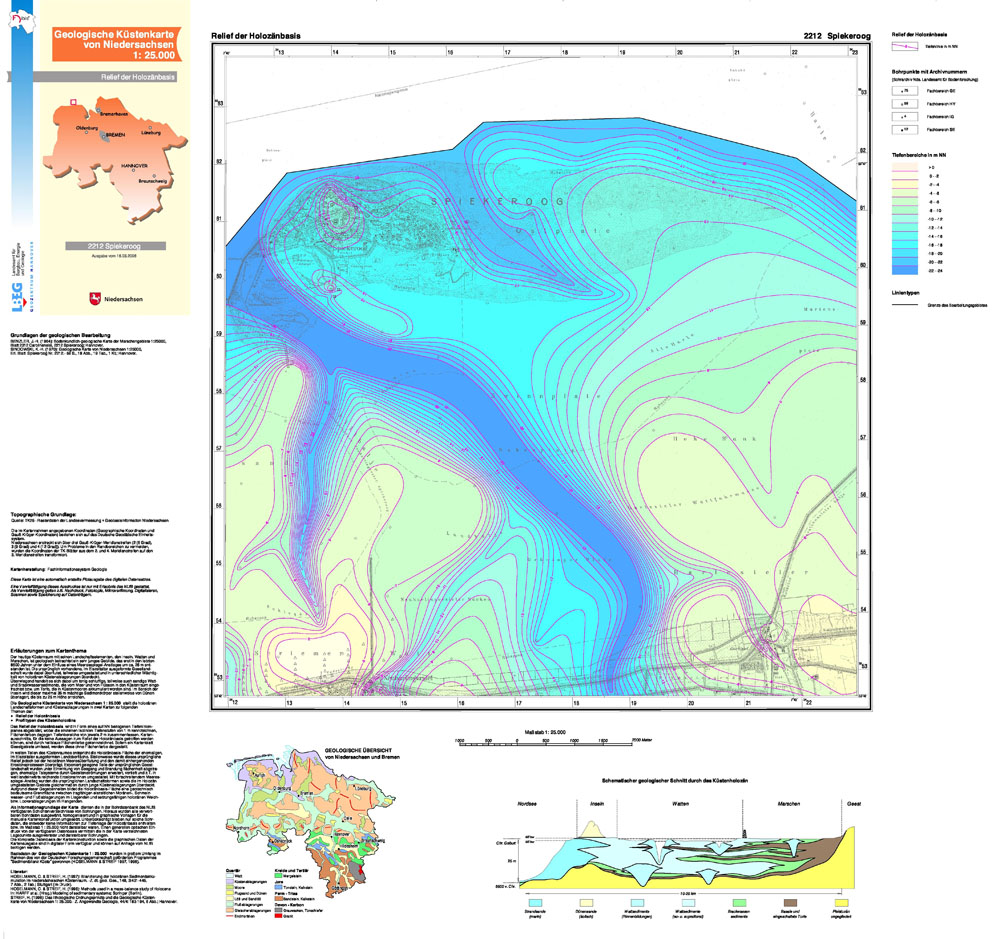 Die Geologische Küstenkarte von Niedersachsen 1:25 000 ist speziell auf die Wiedergabe der geologischen Verhältnisse im Bereich der Inseln, des Wattenmeeres und der Marschen zugeschnitten. Diese Kartenserie vermittelt Informationen über die Mächtigkeit, Verbreitung sowie den generellen Aufbau der holozänen Weichschichten im Küstenraum, die beim Anstieg des Meeresspiegels um circa 25 Meter in den letzten 8.500 Jahren abgelagert worden sind.
