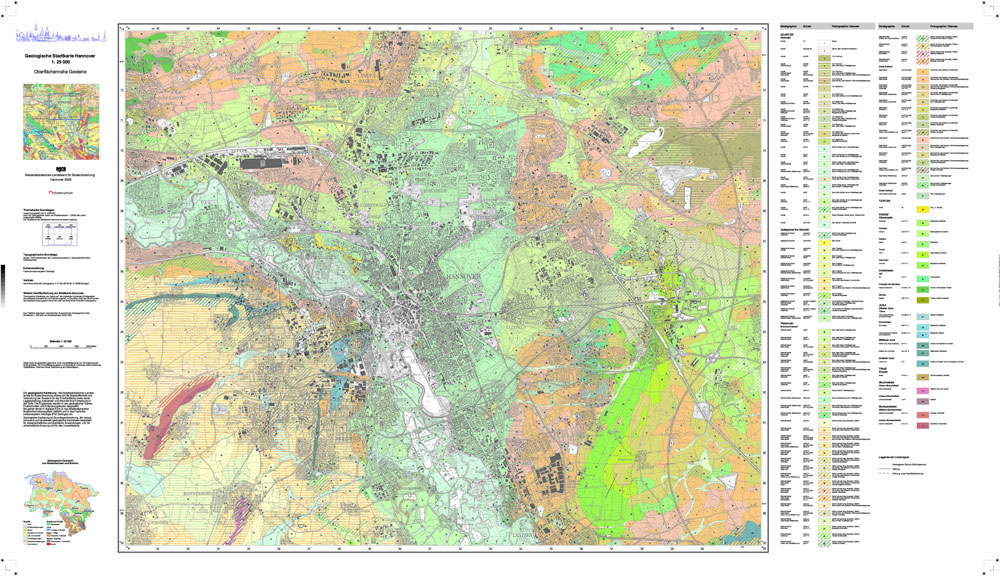Die Geologische Stadtkarte Hannover 1:25 000 - Oberflächennahe Gesteine - zeigt Verbreitung, Alter, Zusammensetzung und Entstehung der Locker- und Festgesteine bis zu einer Tiefe von zwei Metern unter Geländeoberfläche im Gebiet der Stadt Hannover. Bei Festgesteinen lassen sich darüber hinaus in der Regel Rückschlüsse über die Fortsetzung dieser Gesteinsabfolgen in größere Tiefen ableiten. Die Stadtkarte entspricht in der Art der Darstellung der Geologischen Karte von Niedersachsen 1:25 000 (GK25). Im Blattschnitt ist sie identisch mit dem dreiteiligen Kartensatz des gedruckten Gebindes "Geologische Stadtkarte Hannover 1:25 000" aus dem Jahr 1998.
