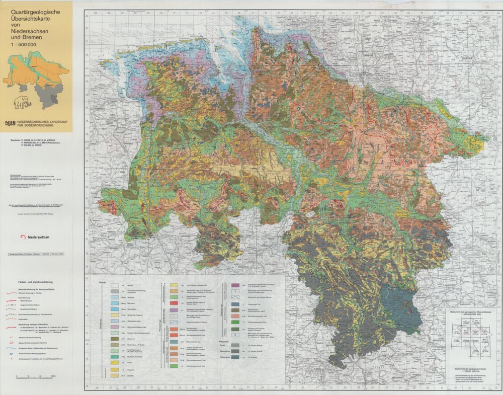Die Quartärgeologische Übersichtskarte von Niedersachsen und Bremen 1:500 000 liefert einen landesweiten Überblick der eiszeitlichen (pleistozänen) und nacheiszeitlichen (holozänen) Ablagerungen in Niedersachsen und Bremen. Das Zeitalter des Quartärs ist in Niedersachsen durch einen mehrfachen Wechsel von Kalt- und Warmzeiten geprägt. Im mittleren Pleistozän waren zur Elster-Kaltzeit und im Saale-Komplex große Teile Niedersachsens vergletschert; das Eis hinterließ Grundmoränen (Geschiebemergel) und Schmelzwasserablagerungen (Kies, Sand und Ton). In den Warmzeiten (Interglazialen) und in der Nacheiszeit (Holozän) entstanden Torfe, Mudden und Mergel. Teile des Küstengebietes wurden dabei überflutet und von Meeres-, Watt- und Brackwasserablagerungen überdeckt.