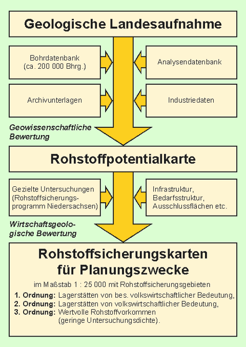 Durch die Berücksichtigung der geowissenschaftlichen und rohstoffwirtschaftlichen Kenntnisse ist es möglich, Rohstoffgebiete zu klassifizieren und auf Karten entsprechend darzustellen. Das Ergebnis sind die so genannten Rohstoffsicherungskarten im Maßstab 1 : 25 000, die für Niedersachsen flächendeckend digital vorhanden sind und fortlaufend aktualisiert werden.