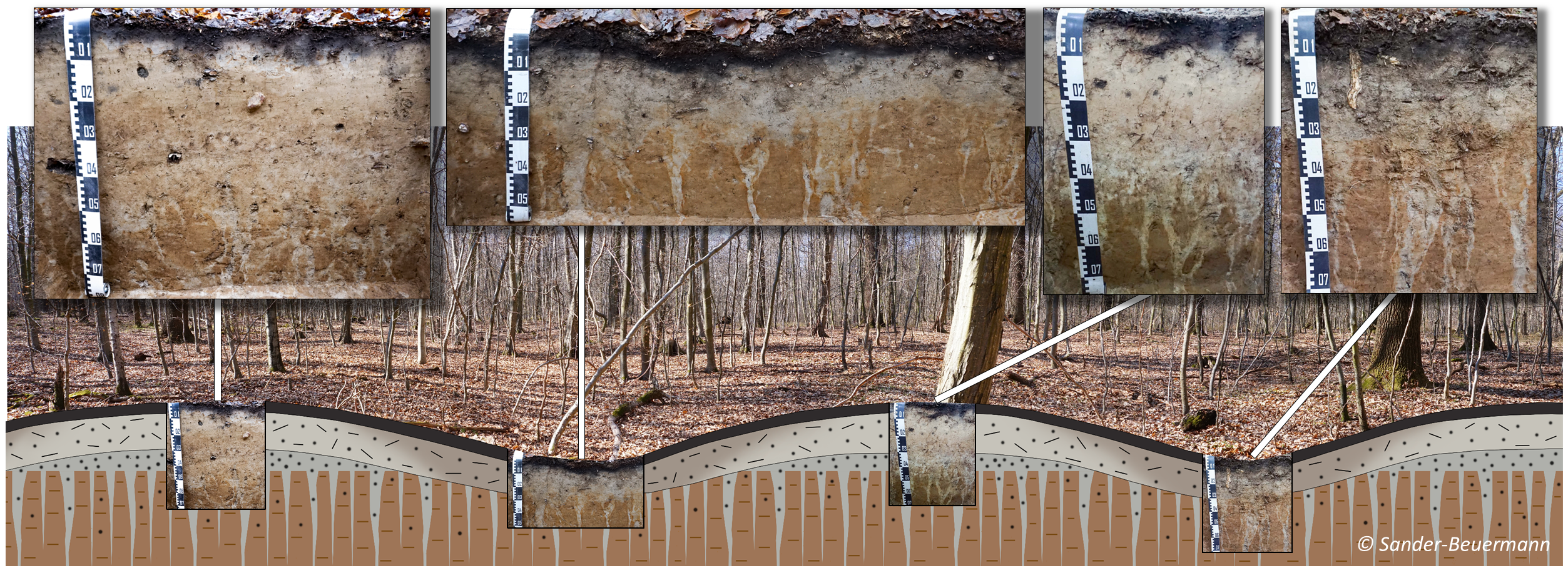 In der folgenden Grafik ist ein solcher Plaggenesch zu sehen. An der Untergrenze des dunklen Horizonts sind noch Reste des ehemaligen Bodens erkennbar, der an der Oberfläche lag, als die Plaggenwirtschaft begann.