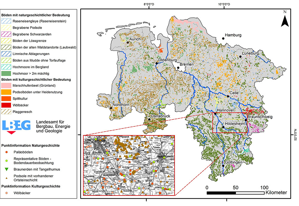 Abbildung 2: Übersicht der flächen- und punkthaften Informationen zu Böden mit natur- und kulturgeschichtlicher Bedeutung in Niedersachsen. Aus: Geofakt 11 (Stadtmann et al. 2024). Detailansicht auf dem NIBIS®-Kartenserver.
