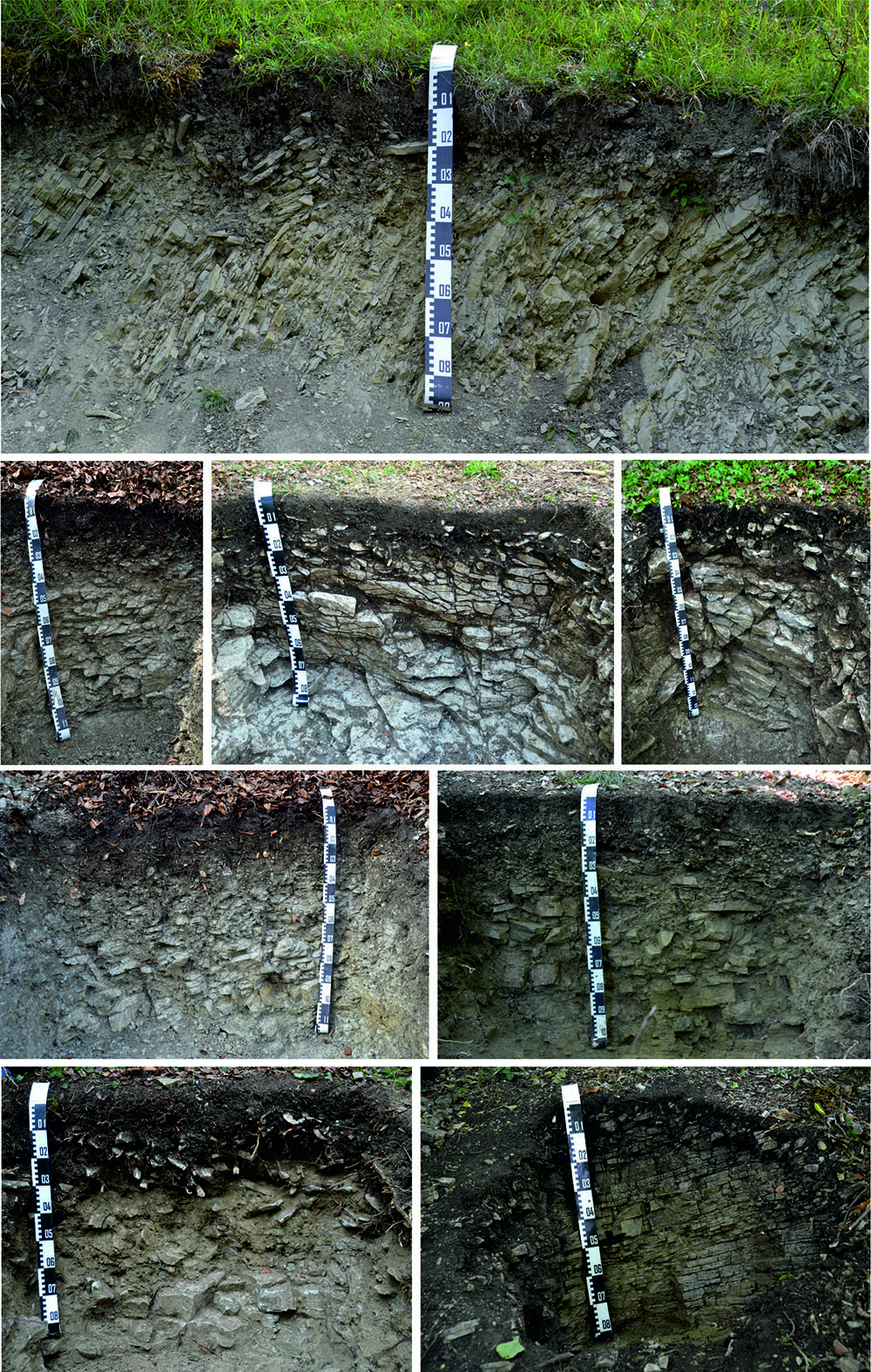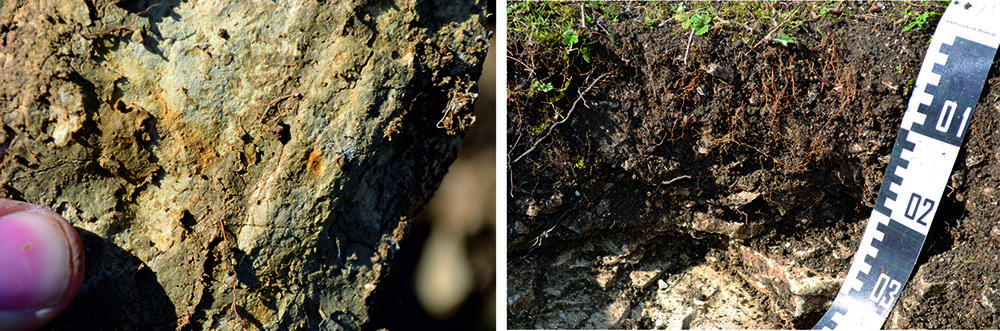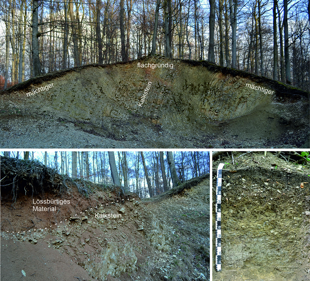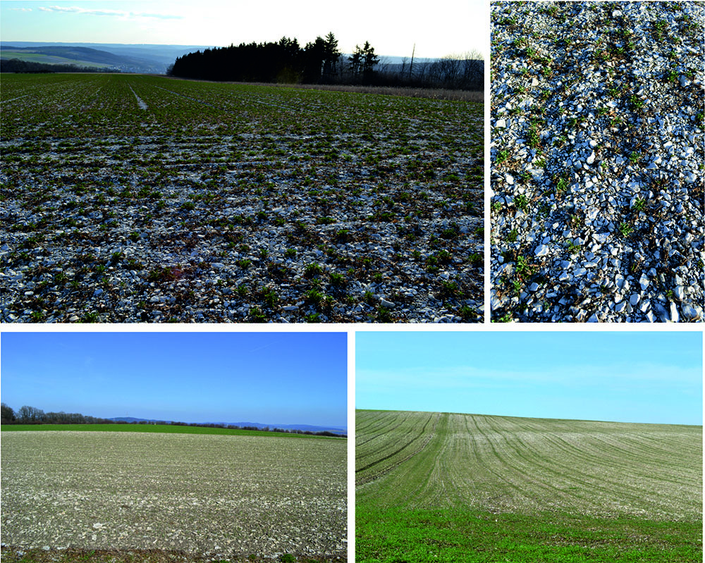 Oben: kleinräumige Unterschiede in der Mächtigkeit des humosen Oberbodens und der Lösung des Kalksteins. Unten links: Überdeckung des Kalksteins mit Löss und damit kleinräumig sehr unterschiedliche Bodeneigenschaften. Unten rechts: mergeliger Kalkstein mit am Hang umgelagertem Schutt und Lösseinfluss. Hier geht der Bodentyp Rendzina in eine Pararendzina über (Fotos: Herrmann & Stadtmann/LBEG).