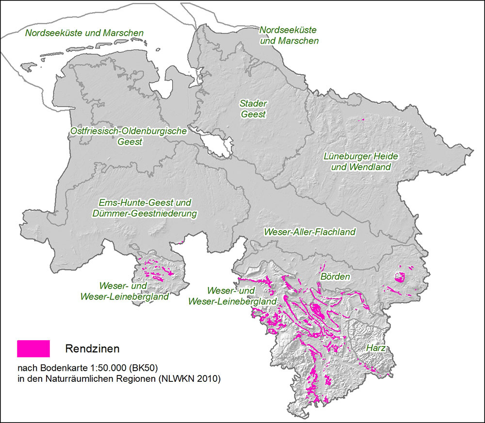 Rendzinen sind in Niedersachsen vor allem im niedersächsischen Bergland verbreitet. Nach der Bodenkarte 1:50.000 (BK50) des LBEG nehmen sie rund 15.700 Hektar und damit nur etwa 0,3% der Landesfläche ein. Weit östlich liegen z.B. die Rendzinen im Elm und Umgebung, westlich finden sie sich im Osnabrücker Bergland. Neben mehreren Höhenzügen in der Schichtstufenlandschaft des Berglands und am Harzrand zieht sich die Verbreitung den Leinegraben entlang bis in die südlichsten Gebiete Niedersachsens. Auffällig ist die weite Verbreitung der Böden z.B. in den Sackbergen bei Alfeld, wo sie größere Flächen einnehmen. Laut BK50 ist das ganze nördliche Niedersachsen Renzinen-frei. Das ganze nördliche Niedersachsen? Nicht doch, ein kleiner farbiger Fleck in der nördlichen Lüneburger Heide fällt als „gallisches Dorf“ auf. Wer nun denkt: Na klar, das ist der „Kalkberg“ in Lüneburg, hat es knapp verfehlt. Denn dieser besteht gar nicht aus Kalkstein, sondern aus Gips- und Anhydrit-Gestein (siehe Erläuterung zum Geotop „Kalkberg“). Am „Kreideberg“ bzw. dem zugehörigen See ist man allerdings richtig. Hier stehen kreidezeitliche Kalksteine an, auf denen Rendzinen zu finden sind.