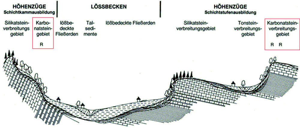 Aber wie kommt es zu dieser sehr ausgewählten Verbreitung dieser Böden? Zum einen sind sie an das Vorkommen des Kalksteins an der Oberfläche gebunden, in Niedersachsen also vor allem Gesteine aus den Zeiten Muschelkalk, Jura und Kreide. Dies kommt besonders im Bereich der Höhenzüge der Schichtstufen im Bergland vor (vgl. Abb. 4).