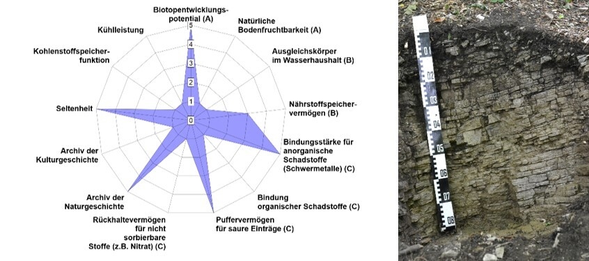 Aus diesen Eigenschaften lassen sich die Bodenfunktionen der Rendzinen ableiten, wie es das folgende Netzdiagramm zeigt. Durch die besonderen Standortbedingungen bieten sie Potenziale zur Entwicklung spezialisierter Biotope. Da die flachgründigen Rendzinen nur wenig Wasser speichern, wirken sie nur eingeschränkt ausgleichend im Wasserkreislauf, können allerdings saure Einträge durch ihren hohen Kalkgehalt gut abpuffern. Weil diese gering entwickelten Böden in der Mehrzahl nur auf festen Kalksteinen ohne oder mit nur sehr geringem Lösseinfluss vorkommen, zählen sie zu den seltenen Böden in Niedersachsen. Rendzinen in den Hochlagen des Berglandes können auf bereits lange bestehenden, alten Waldstandorten das Ergebnis der Bodenentwicklung seit dem Atlantikum sein und haben in diesen Fällen auch eine besondere naturgeschichtliche Bedeutung. Auch an Steilhängen sind sie als Extremstandorte i. d. R. naturnah und selten. Generell gilt, dass bislang wenig durch den Menschen beeinflusste Böden gegenüber Störungen sehr empfindlich sind. Aus diesen unterschiedlichen Gründen weisen Rendzinen oft eine besondere Schutzwürdigkeit auf.