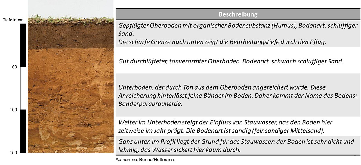 An einem konkreten Beispiel im Landkreis Peine wird deutlich, warum der Boden ein wahrer Alleskönner ist. Es handelt sich um einen schluffig- bis tonig-sandigen Ackerboden, der bereits eine lange Bodenentwicklung erfahren hat (Hintergrundinfos für Bodenkundler/innen hier). Das wird auch anhand der unterschiedlich gefärbten Bereiche und Muster deutlich, die auf dem folgenden Bild zu sehen sind.