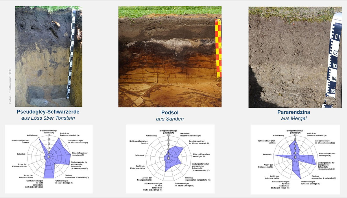 Die Multifunktionalität von Böden hat das LBEG in sogenannten Netzdiagrammen veranschaulicht, welche die unterschiedliche Ausprägung der Bodenfunktionen zeigen. Diese können für jeden Boden in Niedersachsen aufgerufen werden. Dabei wird deutlich: Böden erfüllen die Funktionen sehr unterschiedlich, was aus der großen Vielfalt der Böden resultiert.