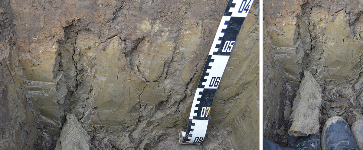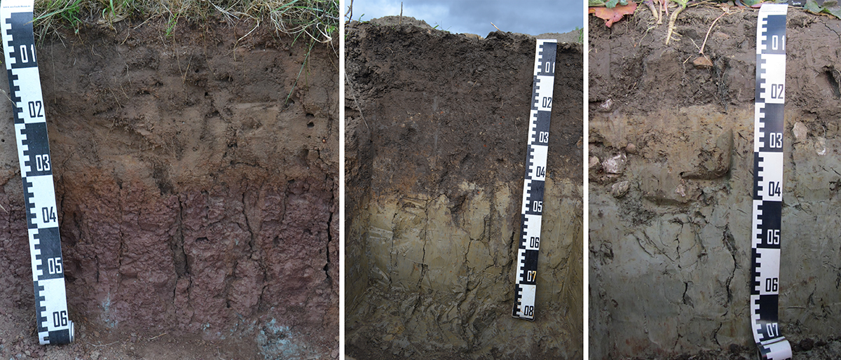 Schrumpfungsrisse (im rötlichen Bereich) in einer Pelosol-Braunerde (links), einem kolluvial überdeckten pseudovergleyten Pelosol (Mitte) und einem Pseodogley-Pelosol (rechts).