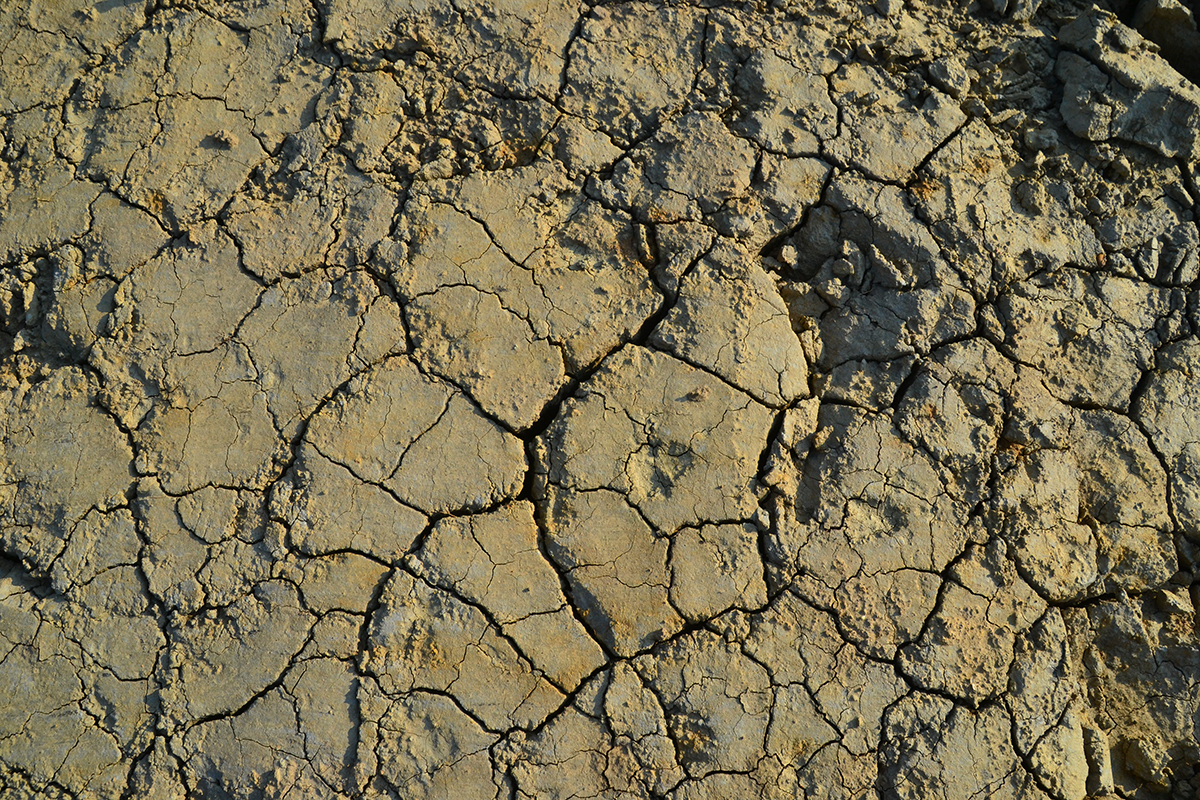 Blick von oben auf die freigelegten Schrumpfungsrisse eines tonigen Bodens.