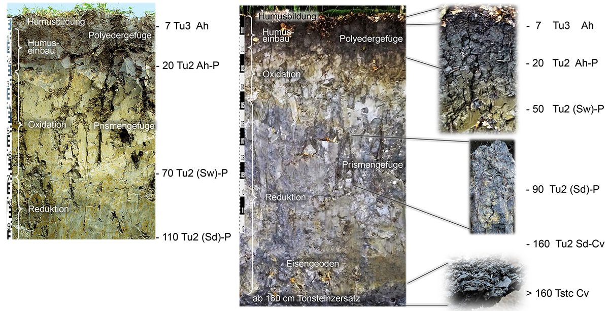 Profilbilder des Pelosols mit Horizontbebeichnungen und Detailaufnahmen (S = Staunässehorizonte).