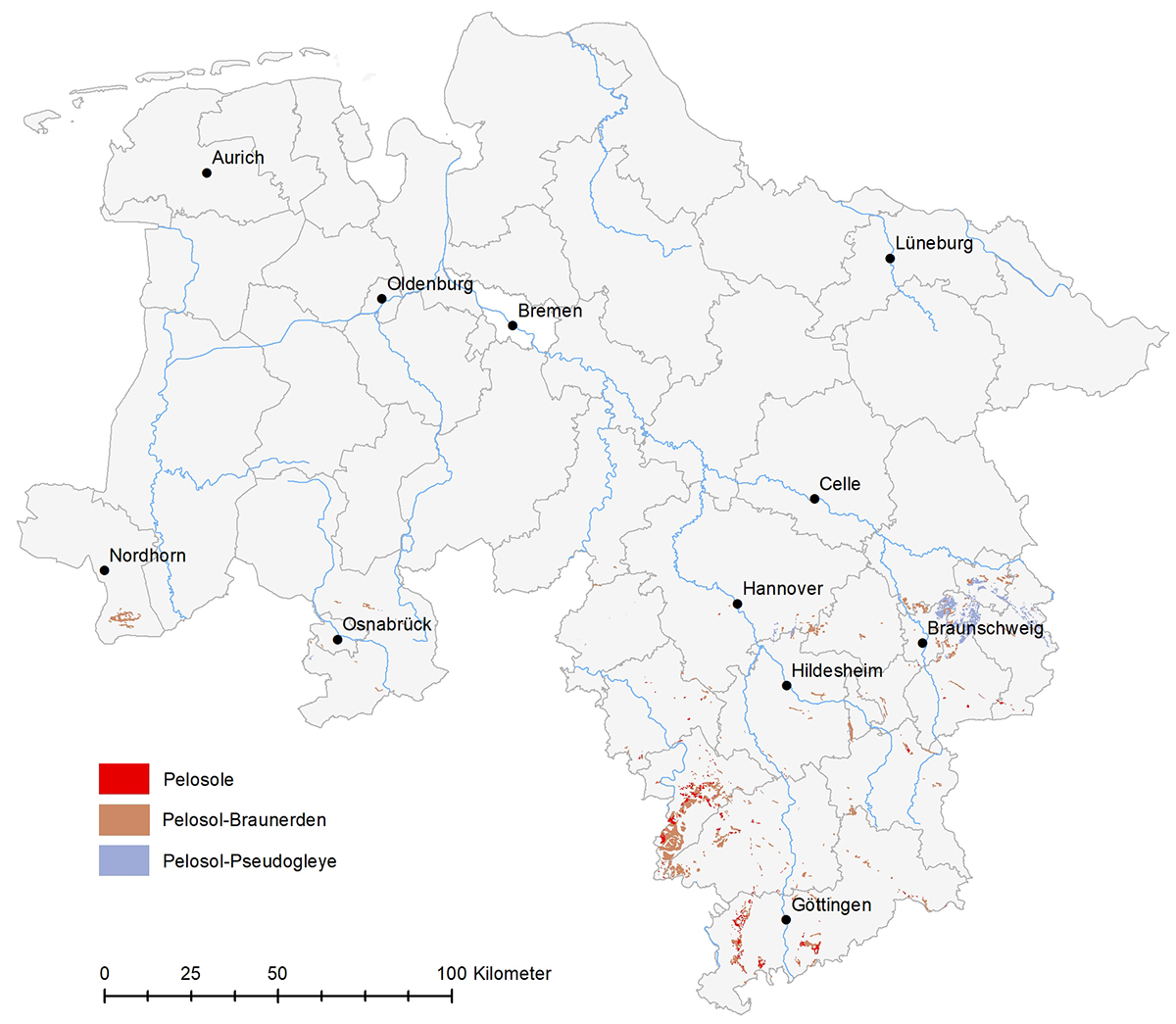 Im Bördenvorland sind Pelosole regional sehr verbreitet (Schaumburger Land, Hämelerwald, südlich des Mittellandkanals bei Sehnde, Ostbraunschweigisches Hügelland zwischen Braunschweig und Wolfsburg). Im Bergland sind sie dagegen kleinräumig an Erosionslagen gebunden. Ein größeres Verbreitungsgebiet findet sich zwischen Stadtoldendorf und dem Süden von Holzminden. Insgesamt sind die Pelosole in Niedersachsen eher seltene Böden. Eine Besonderheit sind die sehr selten auftretenden Pelosol-Tschernoseme oder Tschernosem-Pelosole in der Umgebung von Schöppenstedt im Landkreis Wolfenbüttel.