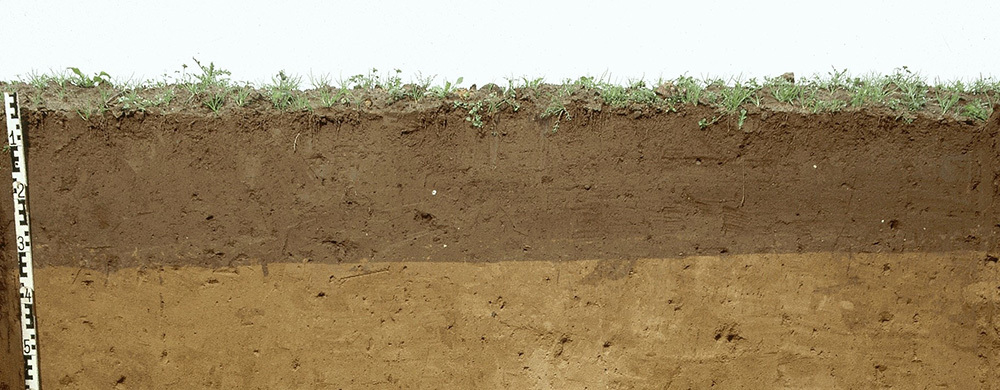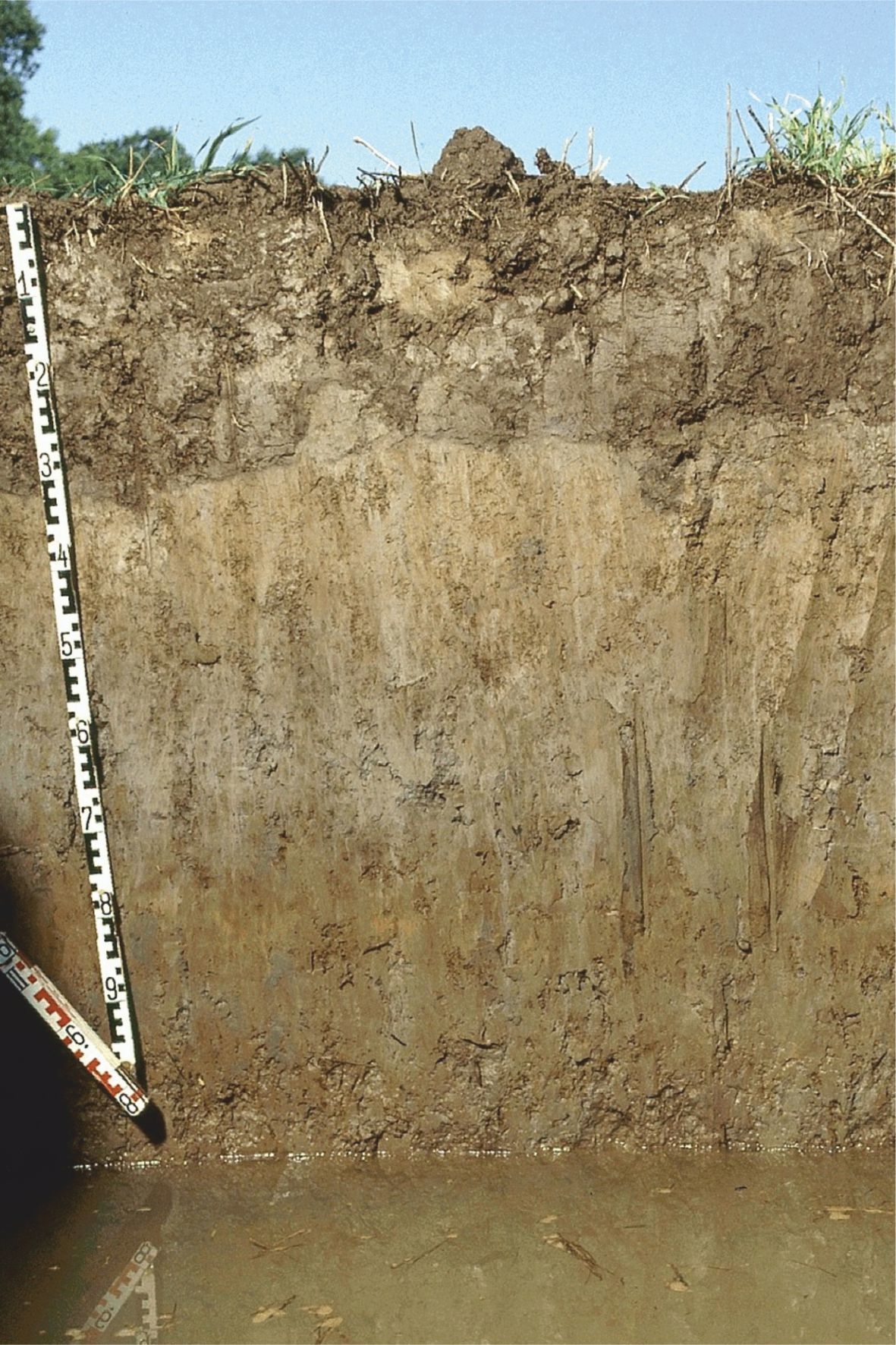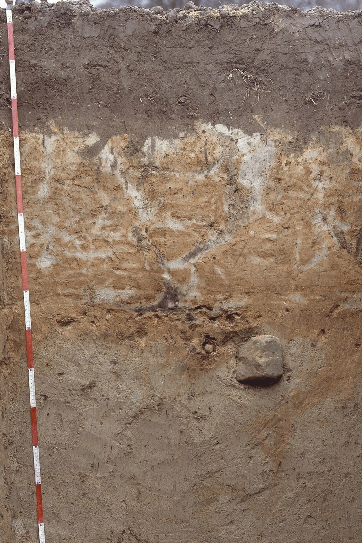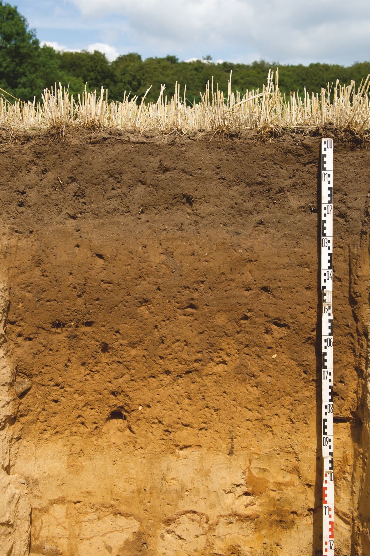 Neben der aktuellen Nutzung, die herangezogen werden kann, gibt es auch im Boden selbst Merkmale, an denen wir einen Ackerboden erkennen. Diese Merkmale resultieren insbesondere aus der Bodenbearbeitung. Wird ein Boden gepflügt, wird der obere Bereich des Bodens durchmischt. Der Humus – die dunkle organische Substanz des Bodens – verteilt sich in dem sogenannten Pflughorizont, in vielen Fällen etwa 30 Zentimeter tief. Bodenkundlerinnen und Bodenkundler sprechen hier von einem Ap-Horizont – „p“ für „gepflügt“. In manchen Böden wirkt die Untergrenze dieses Horizonts wie mit dem Lineal gezogen, wenn der Pflug immer die gleiche Tiefe erreicht.