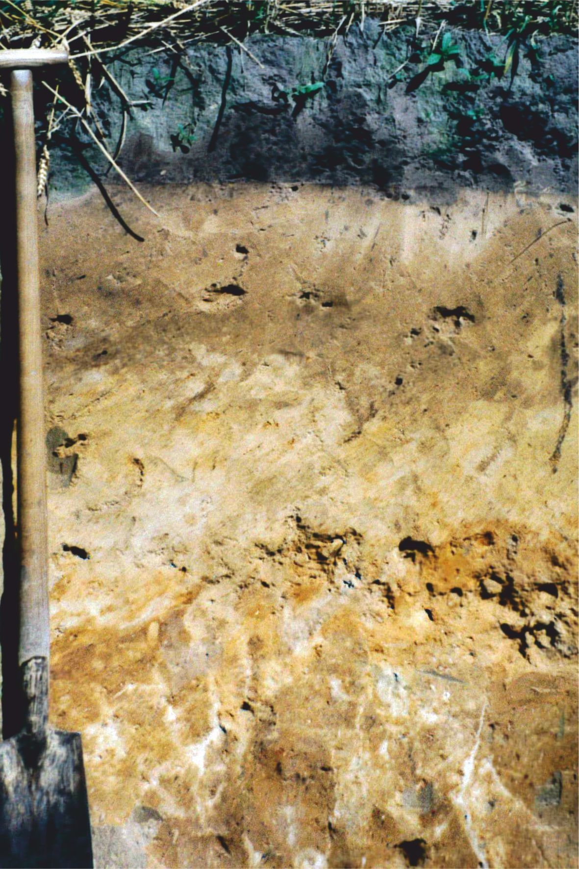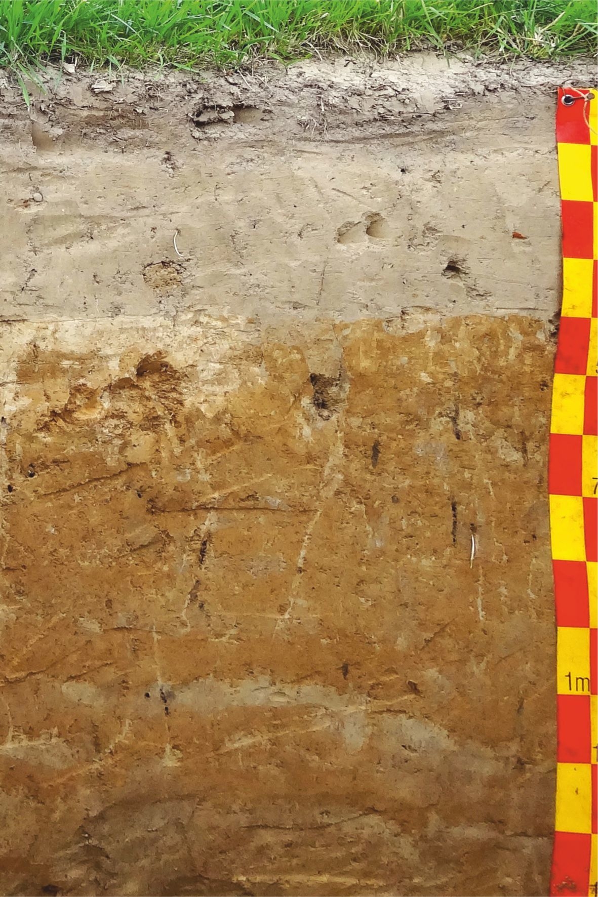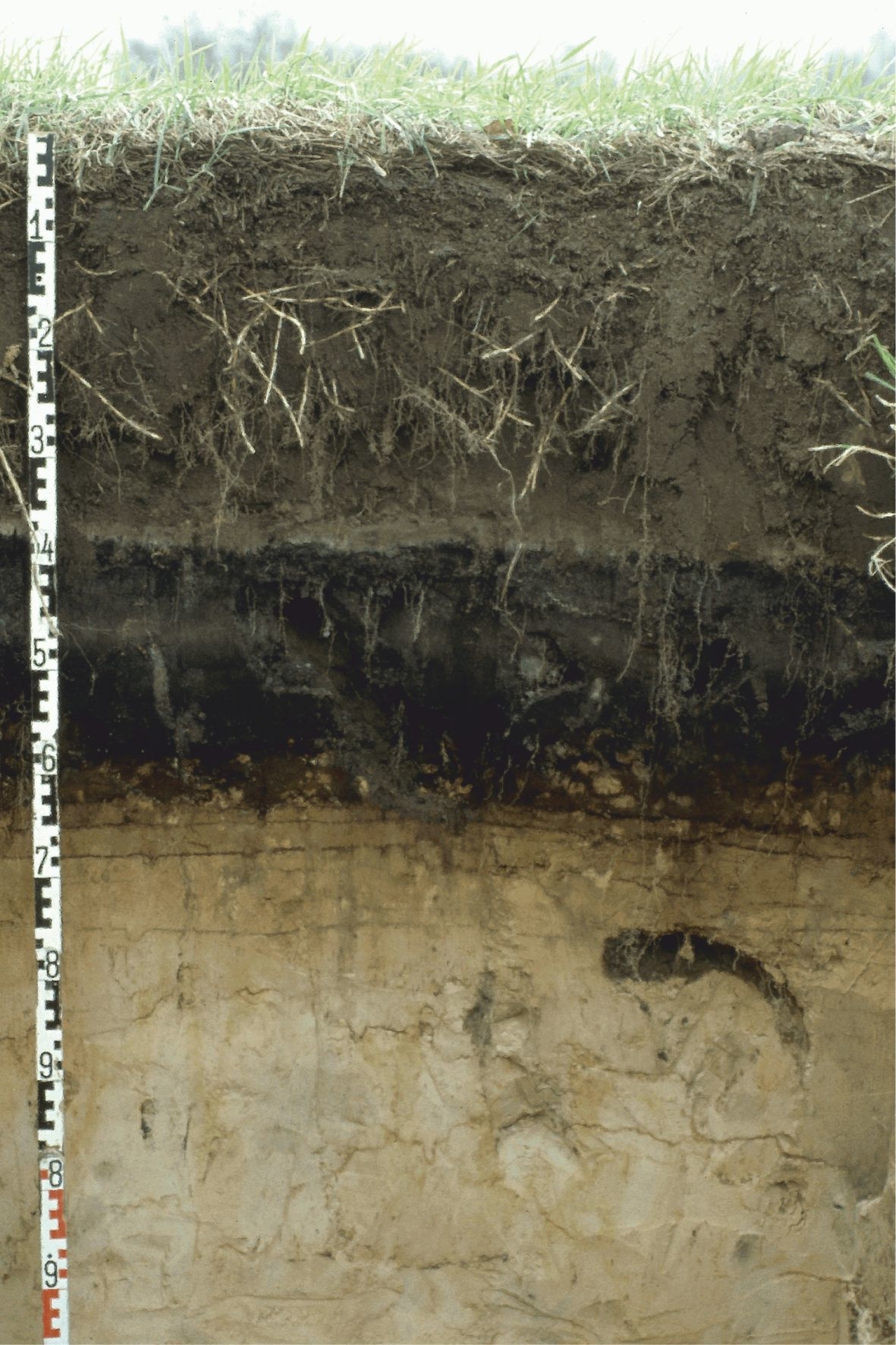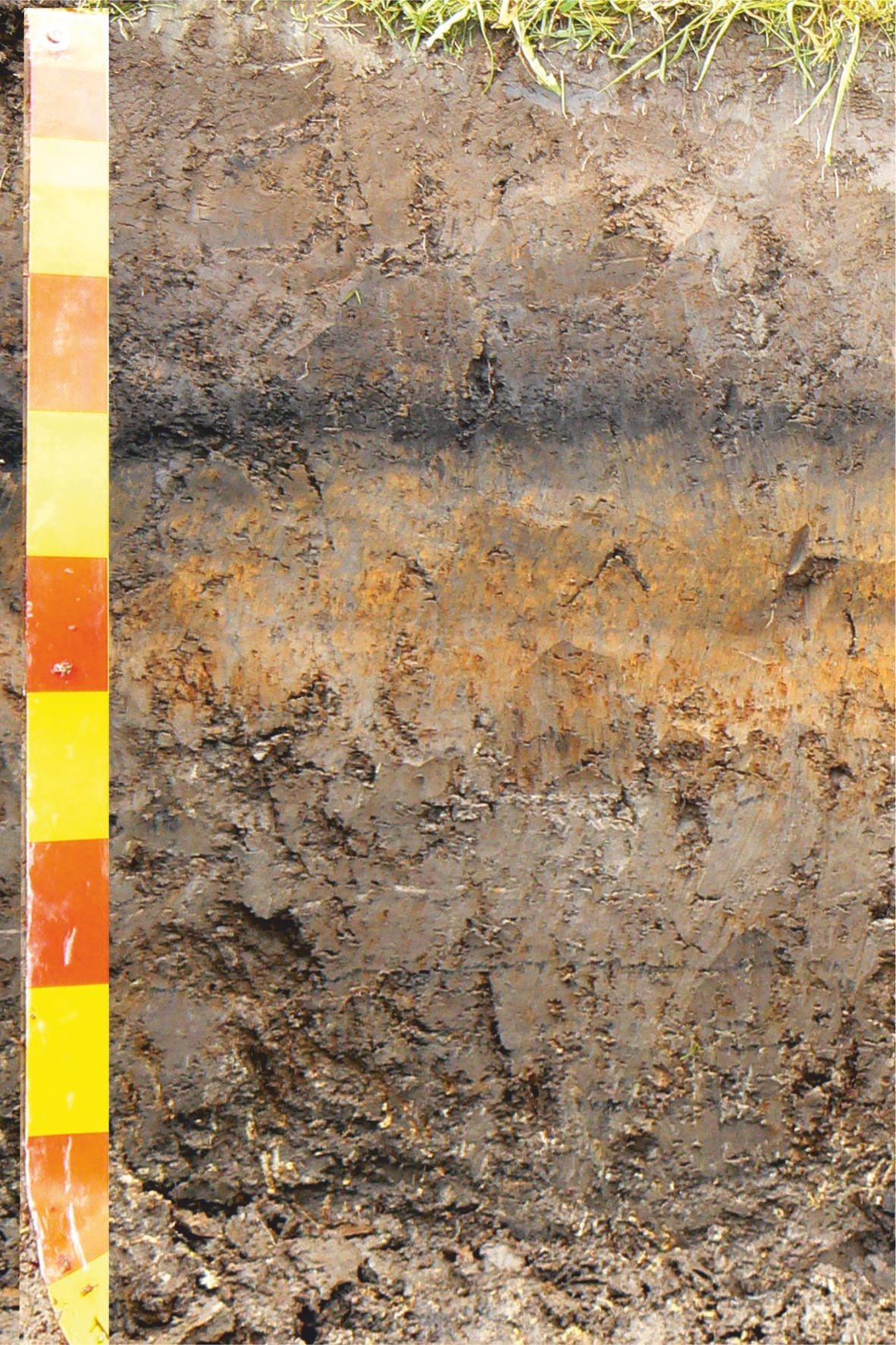 Neben der aktuellen Nutzung, die herangezogen werden kann, gibt es auch im Boden selbst Merkmale, an denen wir einen Ackerboden erkennen. Diese Merkmale resultieren insbesondere aus der Bodenbearbeitung. Wird ein Boden gepflügt, wird der obere Bereich des Bodens durchmischt. Der Humus – die dunkle organische Substanz des Bodens – verteilt sich in dem sogenannten Pflughorizont, in vielen Fällen etwa 30 Zentimeter tief. Bodenkundlerinnen und Bodenkundler sprechen hier von einem Ap-Horizont – „p“ für „gepflügt“. In manchen Böden wirkt die Untergrenze dieses Horizonts wie mit dem Lineal gezogen, wenn der Pflug immer die gleiche Tiefe erreicht.