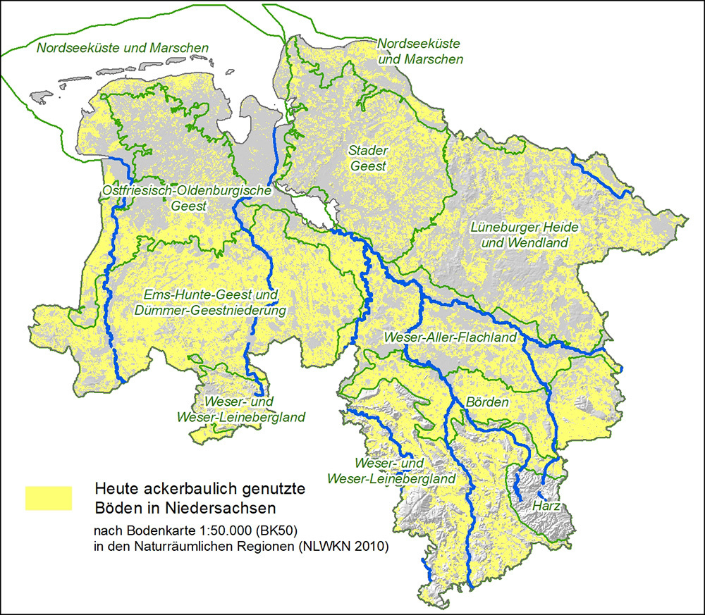 Nicht jeder Boden eignet sich gut für eine Nutzung als Acker. Ein Blick auf die folgende Karte zeigt, dass es in Niedersachsen dabei deutliche regionale Unterschiede gibt. Die grauen Flächen werden vor allem als Grünland oder als Wald genutzt. Die gelben Flächen hingegen sind unter Ackernutzung – unsere Ackerböden.
